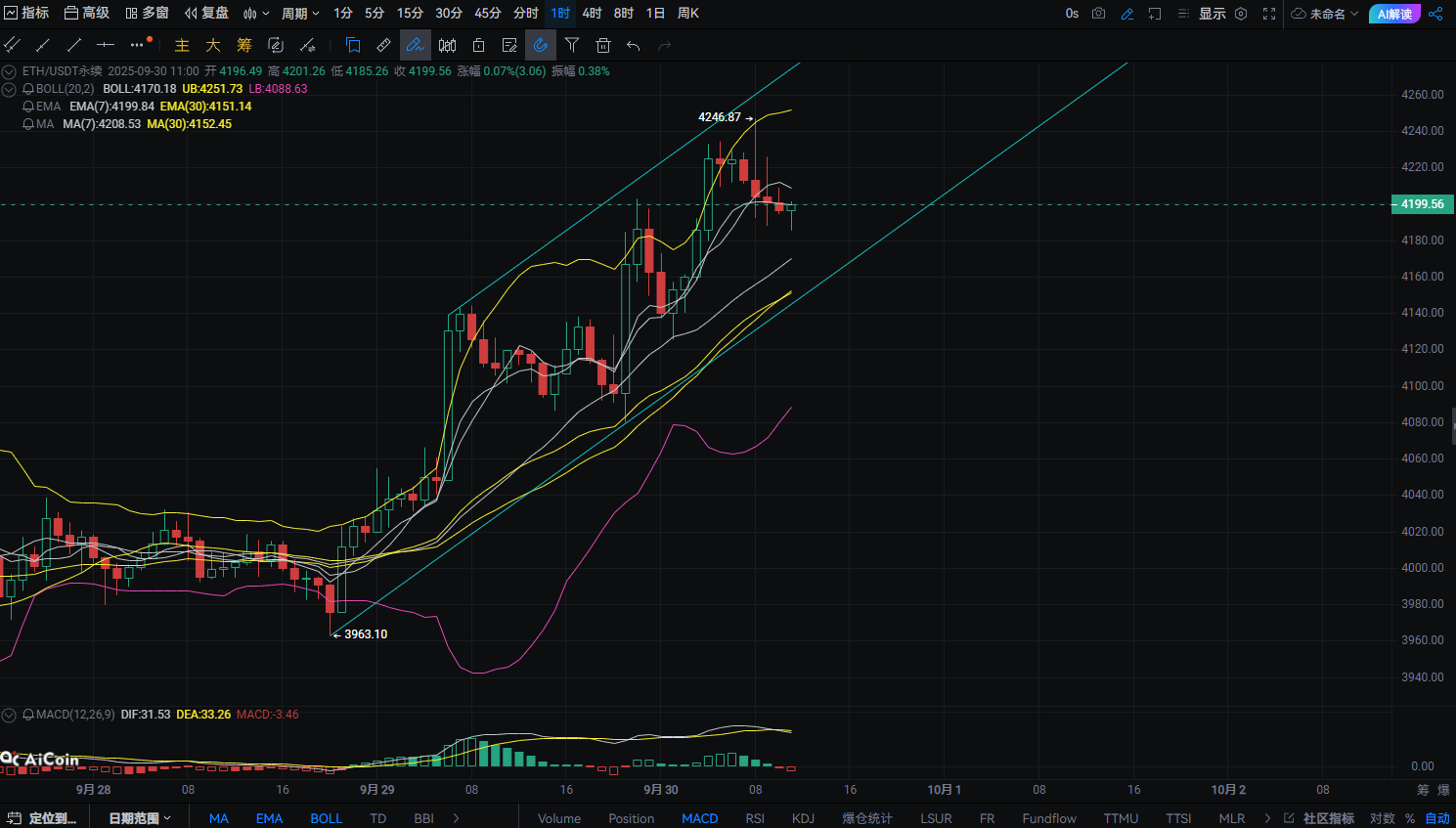 第一目标:4230-4250(此处是布林带上轨压力 + 前期成交密集区,需重点关注突破力度);
