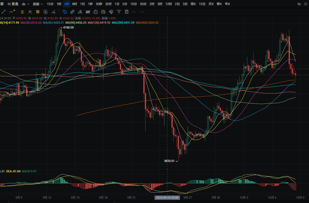 以太日线昨日从最高4755附近下跌至最低4425附近 收线在4445附近 下方支撑位于4340附近 跌破则可看至4230附近 回踩可在附近进行接多 上方压力位于4585附近 突破则可看至4720附近 反弹至附近可进行接空 MACD多头缩量 四小时下方支撑位于MA30附近 跌破则可看至MA90附近 回踩可在附近进行接多 上方压力位于MA7均线附近 突破则可看至4605附近 反弹至附近可进行接空 MACD空头增量 形成死叉