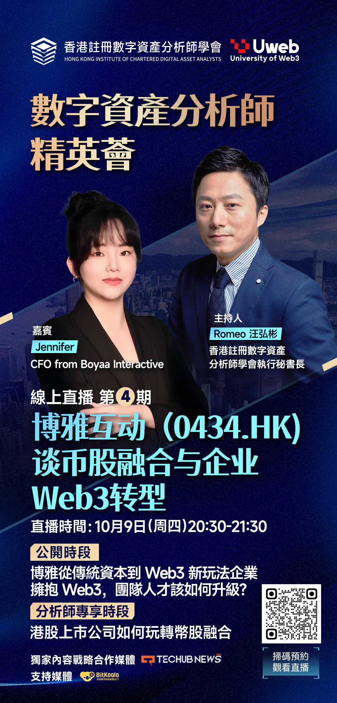 由香港注册数字资产分析师学会与Uweb联合主办的“数字资产分析师精英荟”线上直播第4期将于10月9日(周四)20:30-21:30重磅来袭!本期直播由香港注册数字资产分析师学会执行秘书长Romeo汪弘彬担任主持人,特邀博雅互动(0434.HK)首席财务官Jennifer作为嘉宾,围绕“博雅互动谈币股融合与企业Web3转型”这一前沿主题展开深度探讨。在公开时段,Jennifer将分享博雅互动如何从传统资本市场迈向Web3新玩法,解析企业拥抱Web3的战略路径,以及团队人才在这一转型过程中需要如何升级迭代。而在分析师专享时段,将聚焦港股上市公司如何通过币股融合实现创新突破,揭秘博雅互动在数字资产领域的独特实践。期待这场思想碰撞的直播,带你洞悉Web3时代的企业转型新机遇!