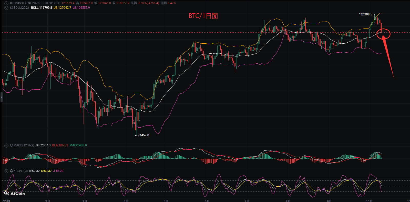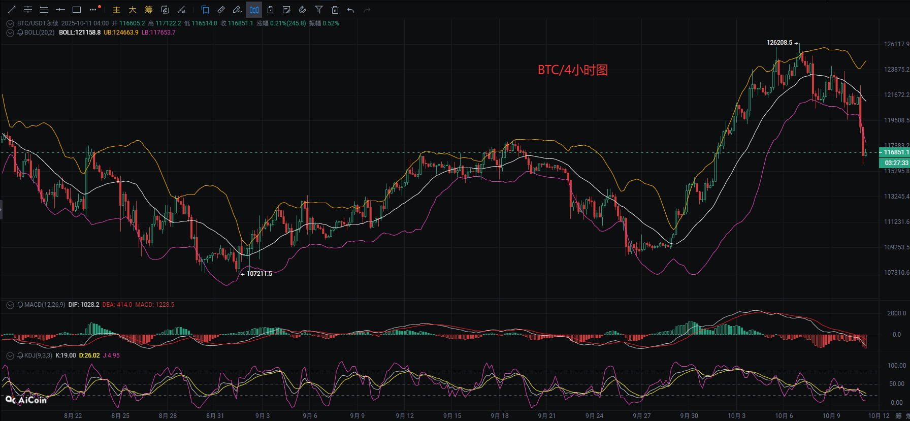 短周期小时图看,布林带呈向下开口,日内晚间至凌晨这波近7千余点回调,价格一路从高位112500附近一线下降至115800位置,短期价格波动较大,由此可见这波回调力度的强势。后续重点关注日线中轴一线,若是不能有效企稳,预计价格还将下行,破位可以跟进短空,但是注意把握收益,短期走势弱势较强,后续预计回调将会延续,所以暂时操作不建议做多,稳健等反弹入场。上方压制关注119000区域,下方关注115200