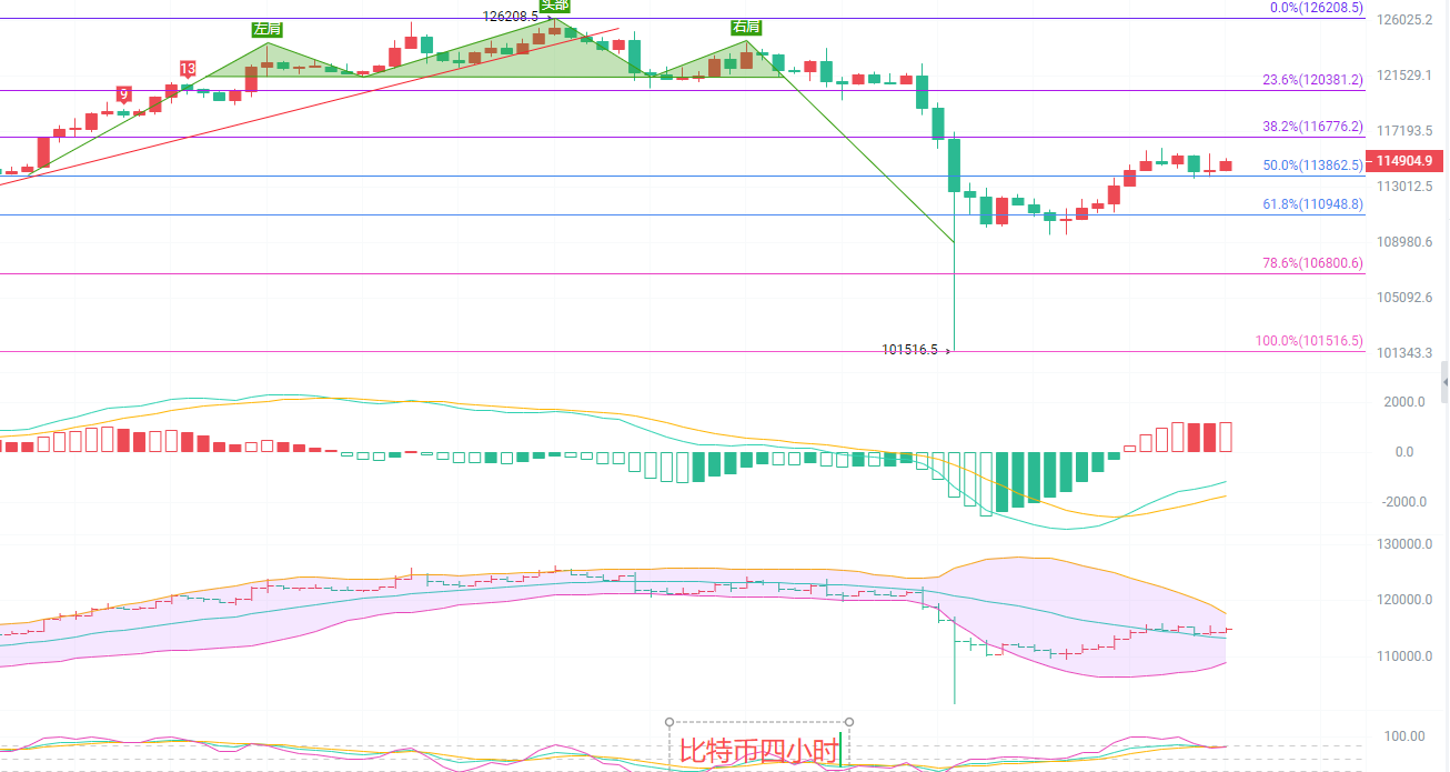 四小时K线冲击EMA30以后115700回落,目前受阻黄金分割线0.5的支撑113850,下一步就是试探底部支撑的强弱,加上MACD放量平和,DIF和DEA低位扩散,布林带出现收缩,上轨压力位已经下压到了117600,底部下轨支撑来到了109000,多空在收缩行情处于三角收口阶段,所以115500南下短线空有利可图可以持有