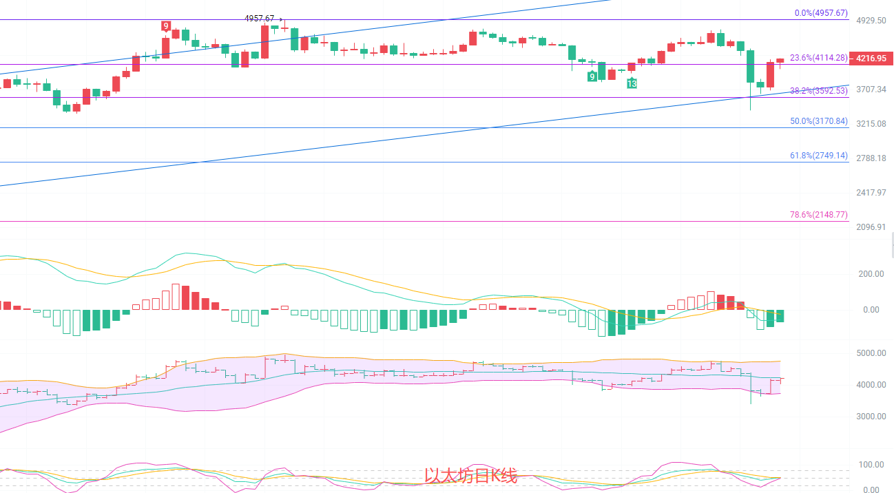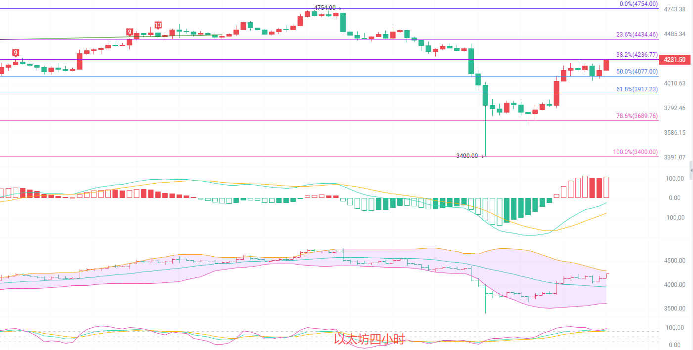 日K线发稿前最高4239,最低4034,主力在0.236一线横盘受阻EMA15压力4236,短线支撑关注4115,MACD开始收缩,DIF和DEA在0轴线横盘,K线连续试探布林带中规压力4240,也就是昨日提到的顶部压力位,从目前的趋势上看K线来到了多空交换点试探,可以一次作为短线试仓的基点来操作,这样可以止损的位置会小止盈的空间大
