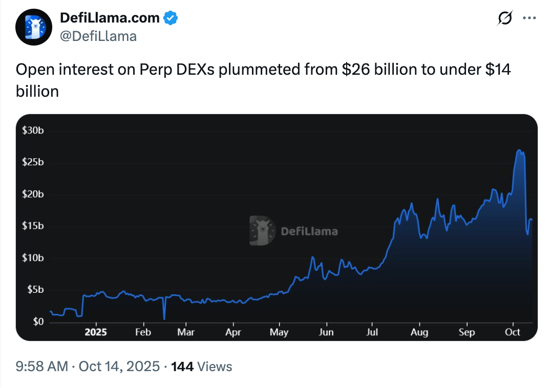 DeFiLlama 在 X 平台上发布数据并指出,就在上周,DEX 的单周交易量还一度突破了 1770 亿美元,刷新了历史纪录。然而,在此次市场闪崩的冲击下,Perp DEX 的未平仓合约已然从 260 亿美元急剧缩水至不到 140 亿美元,近乎腰斩。