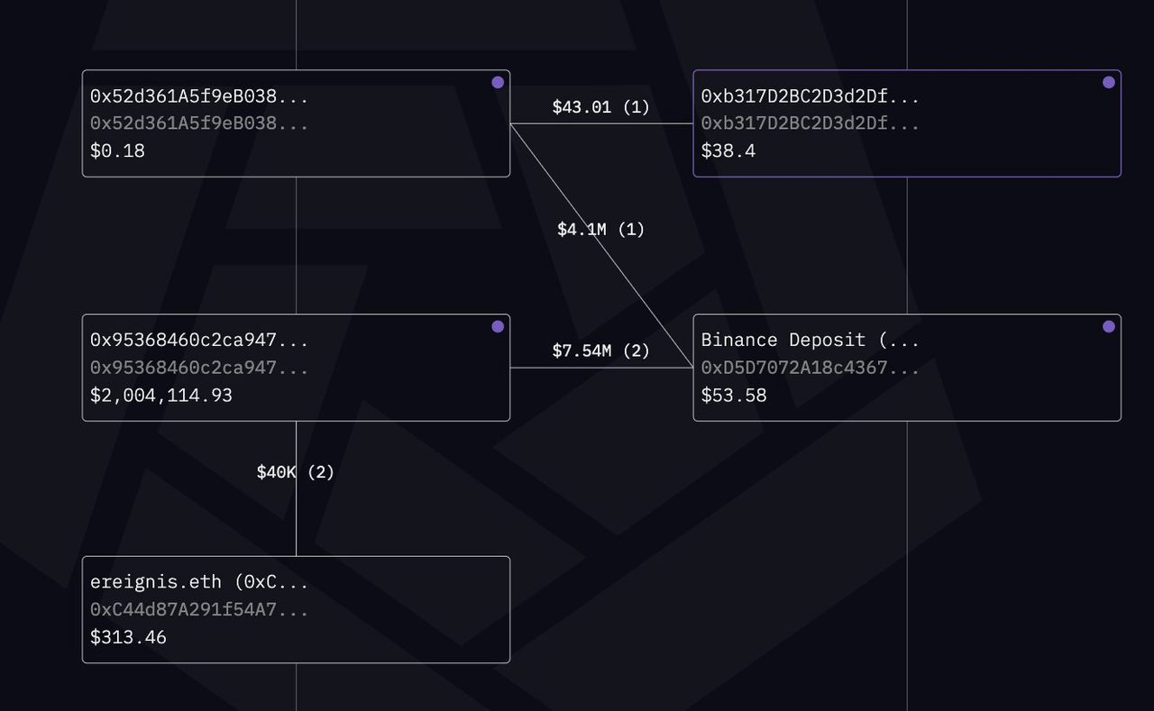 与此同时,Eye 在深入分析 7.35 亿美元 BTC 空头的巨鲸地址(0xb317 开头)后发现,该地址从钱包「0x52d3」收到了手续费;而在发送这笔手续费前,钱包「0x52d3」向币安的一个存款地址「0xD5D7」存入了 410 万美元的 USDC,这一地址不久前还曾收到钱包「0x9536」转入的 754 万美元。值得注意的是,钱包「0x9536」在做空开始的两周前,曾向「ereignis.eth」发送了价值 4 万美元的 USDT。