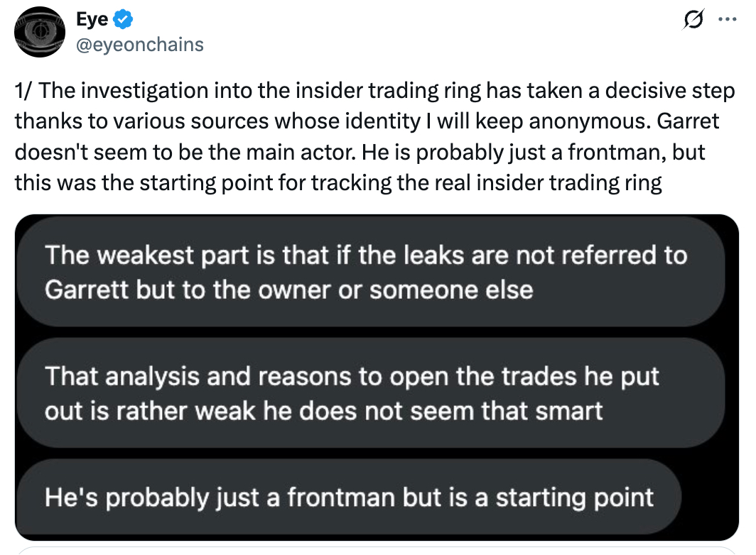 直到今日,链上侦探 Eye 再次发推,带来了一个重磅消息:得益于多位匿名消息人士的帮助,针对涉嫌内幕交易团体的调查已取得重大进展。消息人士透露,Garret 可能并非真正的主谋,而只是一个「幌子」,但他却是追踪真正内幕人士的关键起点。