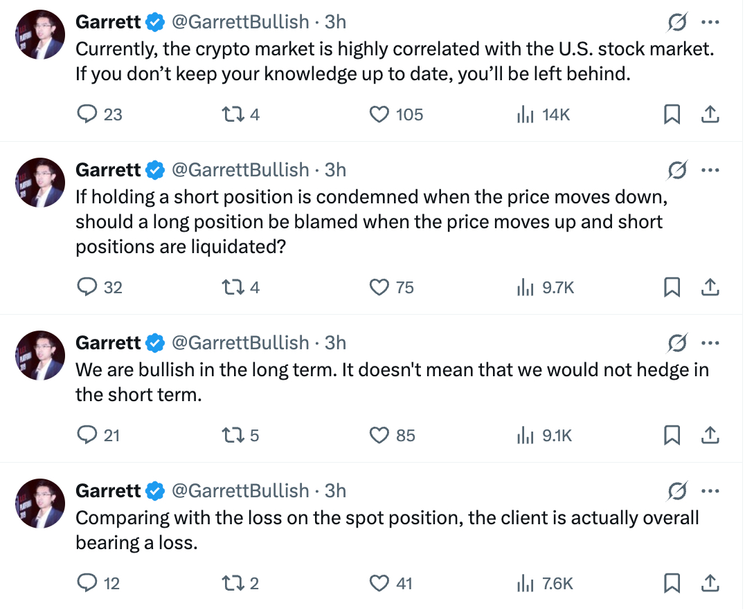 而截至撰文时,Garrett Jin 已连发多条推文试图力证自身清白,称其团队长期看好的立场与短期对冲操作并不矛盾。