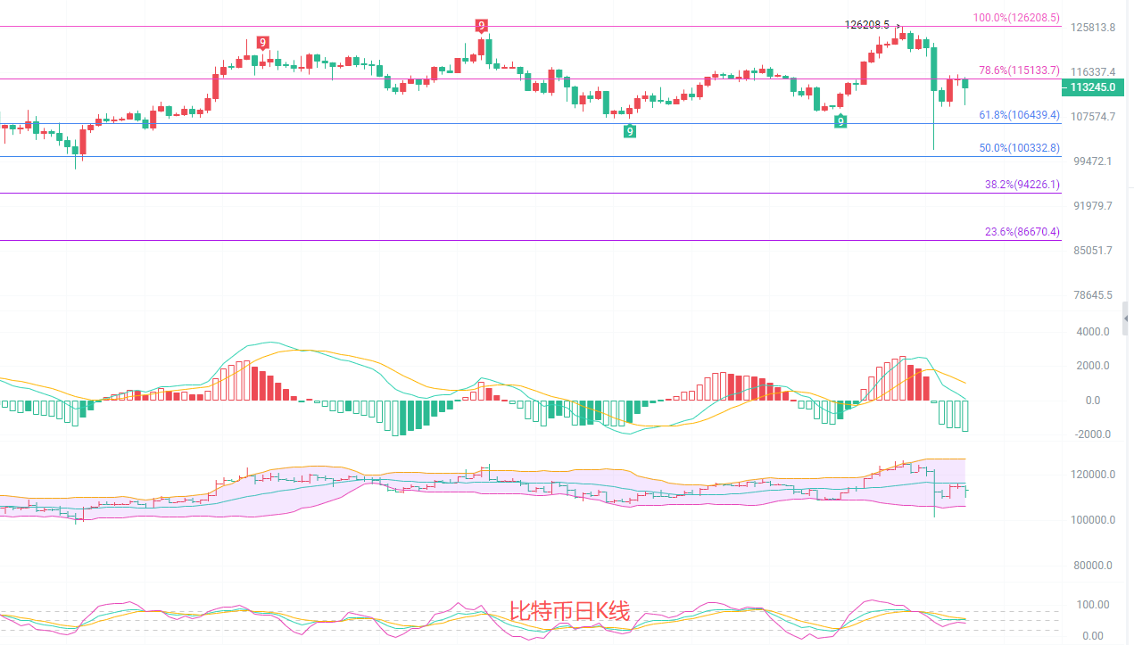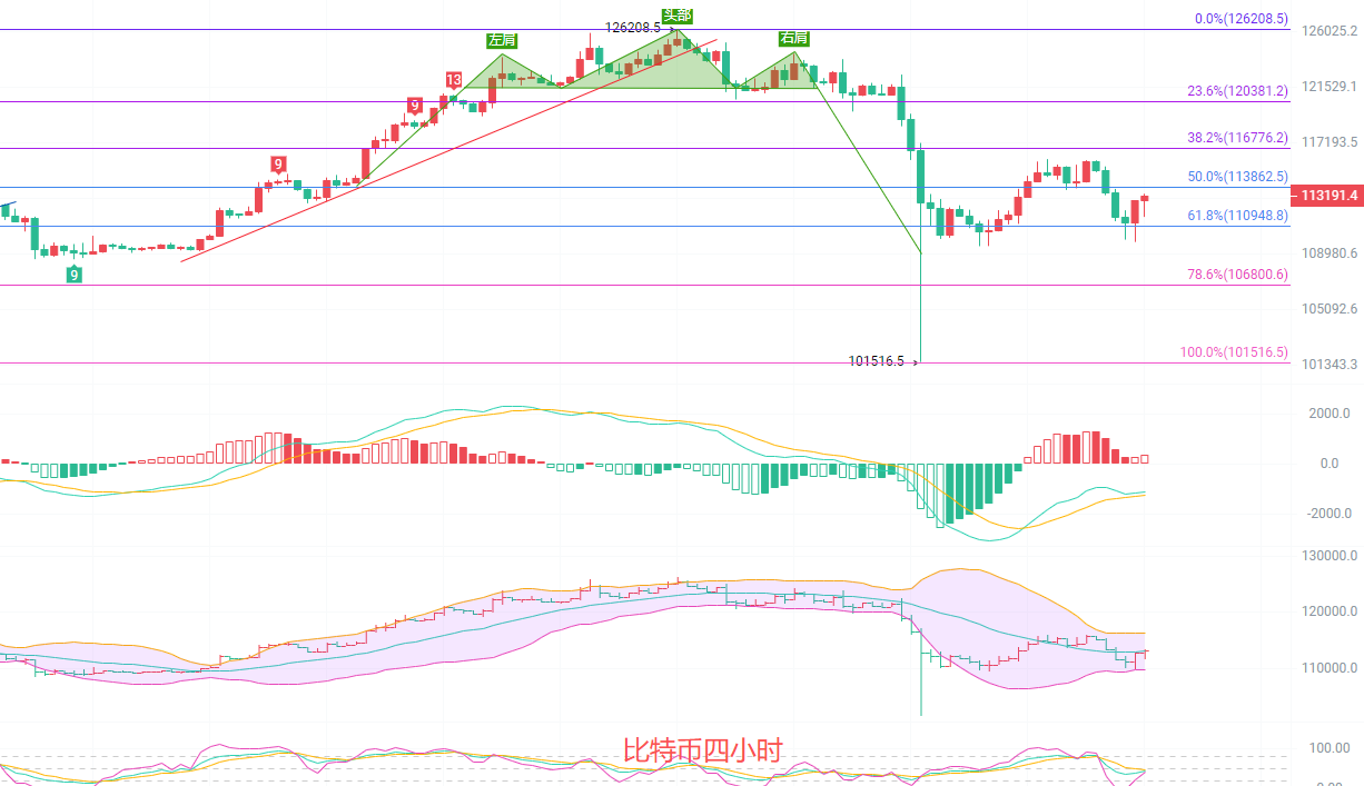 日K线发稿前最高115360,最低109800,再看黄金分割线支撑0.618这个位置106440,加上趋势指标收缩,MACD延续缩量增筹,DIF和DEA开始向下冲击0轴线,整体趋势依旧是空势,布林带中规阻力依旧存在所以116600压力位有效,高位南下思路不变