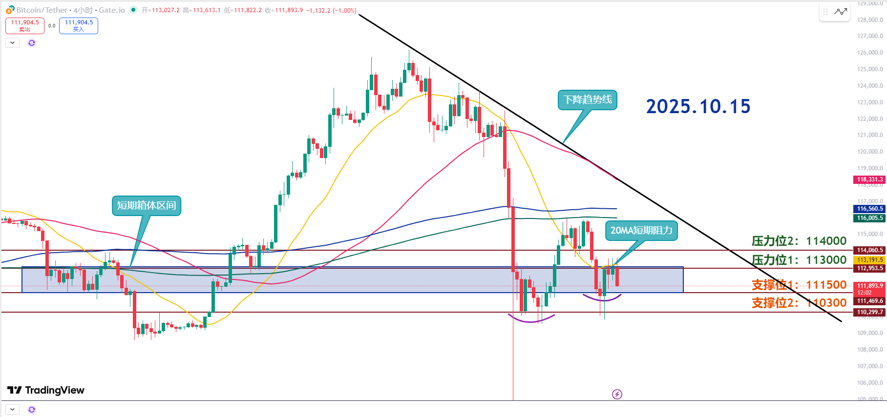 第一支撑111.5K,只要不跌破111.2K,短线还有修复希望;要是能在这一带收稳,有机会出一波短线反弹。
