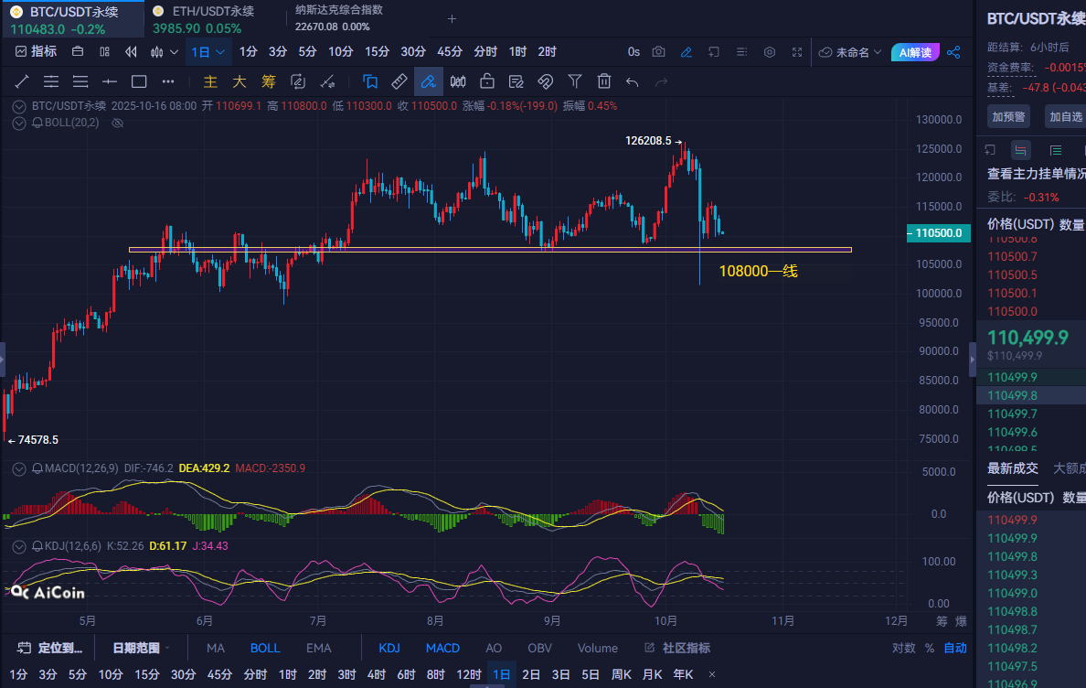 早间分析:从当前1小时图来看,大饼价格再次接近108000强支撑附近,短线虽有反弹,但动能极其匮乏,回弹幅度微弱且缺乏有效买盘支撑,整体结构仍处于明确的偏弱状态。4小时图中,大饼运行在布林带下轨附近,底部正蓄力吸筹,K线反复测试底部支撑。布林带三轨呈平行运行,开口有扩张趋势,预示市场即将又迎来方向选择,预测会继续试探108000一线支撑。