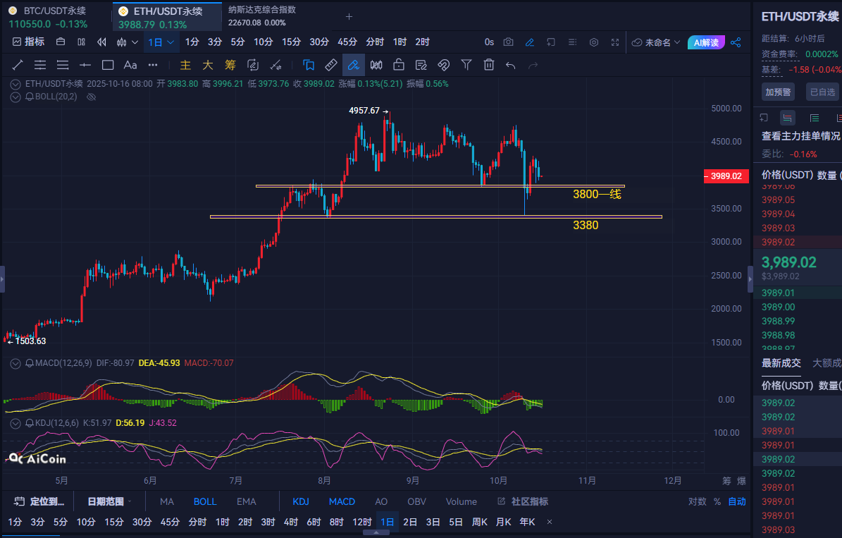以太目前走势形成高位震荡下行趋势。当前短线价格呈现小幅反弹,但整体仍处于弱势。从4小时图中看,价格在10月15日出现大阴线跌破4000整数关口,目前反弹力度较弱,未能有效突破前高。技术指标MACD4小时周期MACD柱状图持续缩量,在零轴下方运行,空头力量虽占优但有减弱迹象。