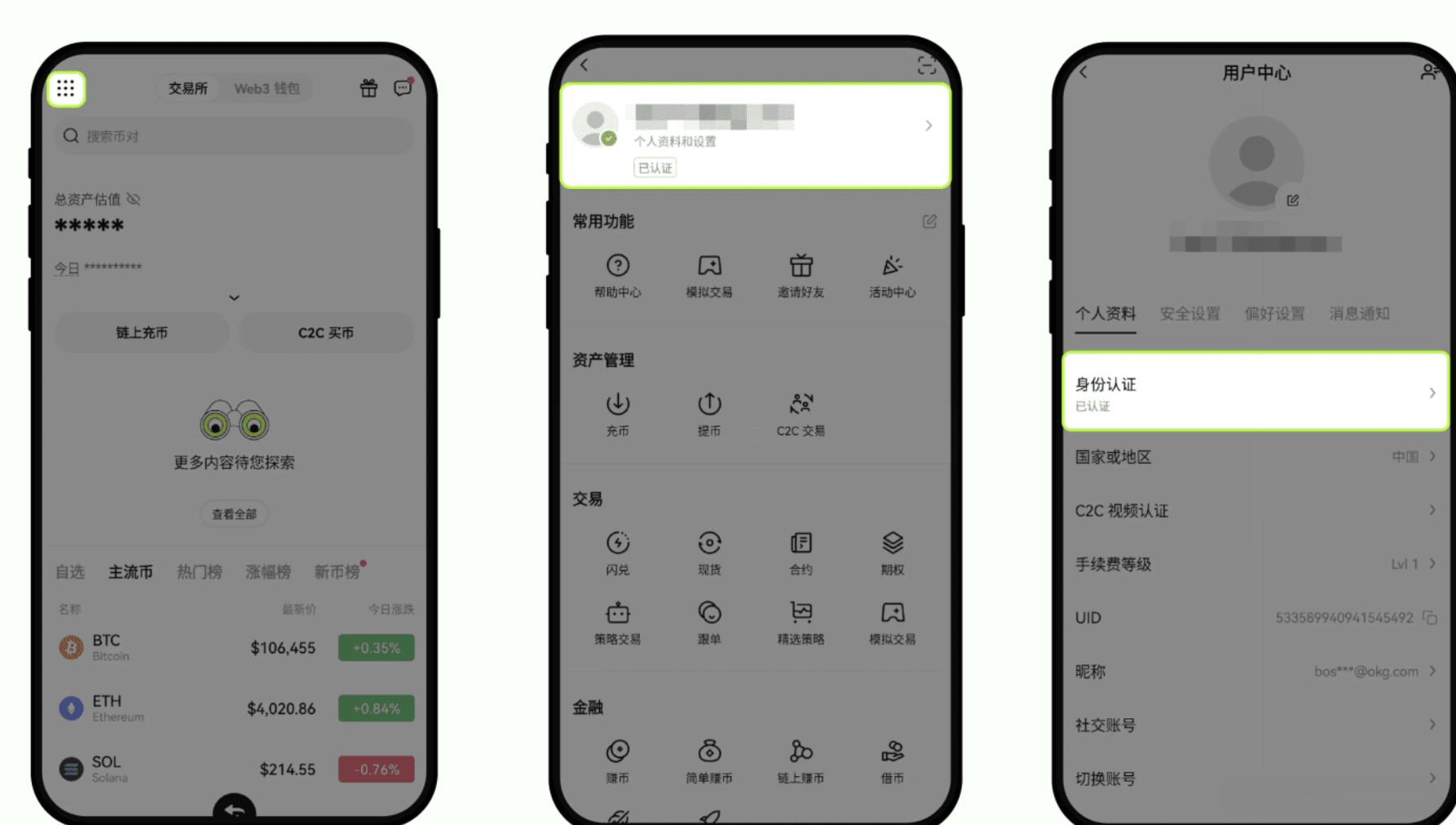 (图 5)身份认证的步骤也简单,点 OKX App 左上角就行,跟着这三步走,身份认证就能搞定。那