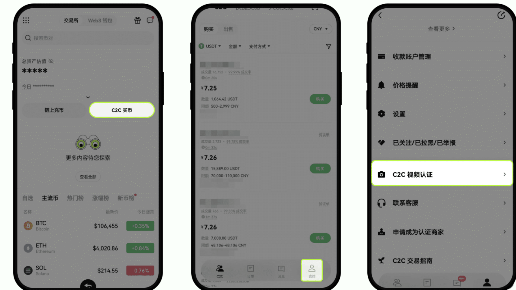 新手咋做出入金?其实在 OKX App 里,出入金对应的就是 C2C 买币,只要做一次视频认证,之后买币就特别方便。