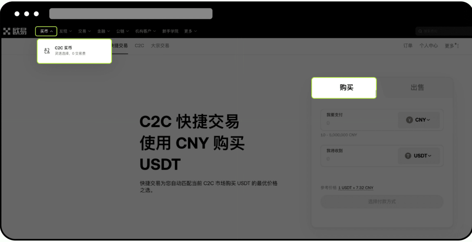 买币第一步:点【买币】-【C2C 买币】-【快捷交易】,再点【购买】,选好要购买的数字资产;