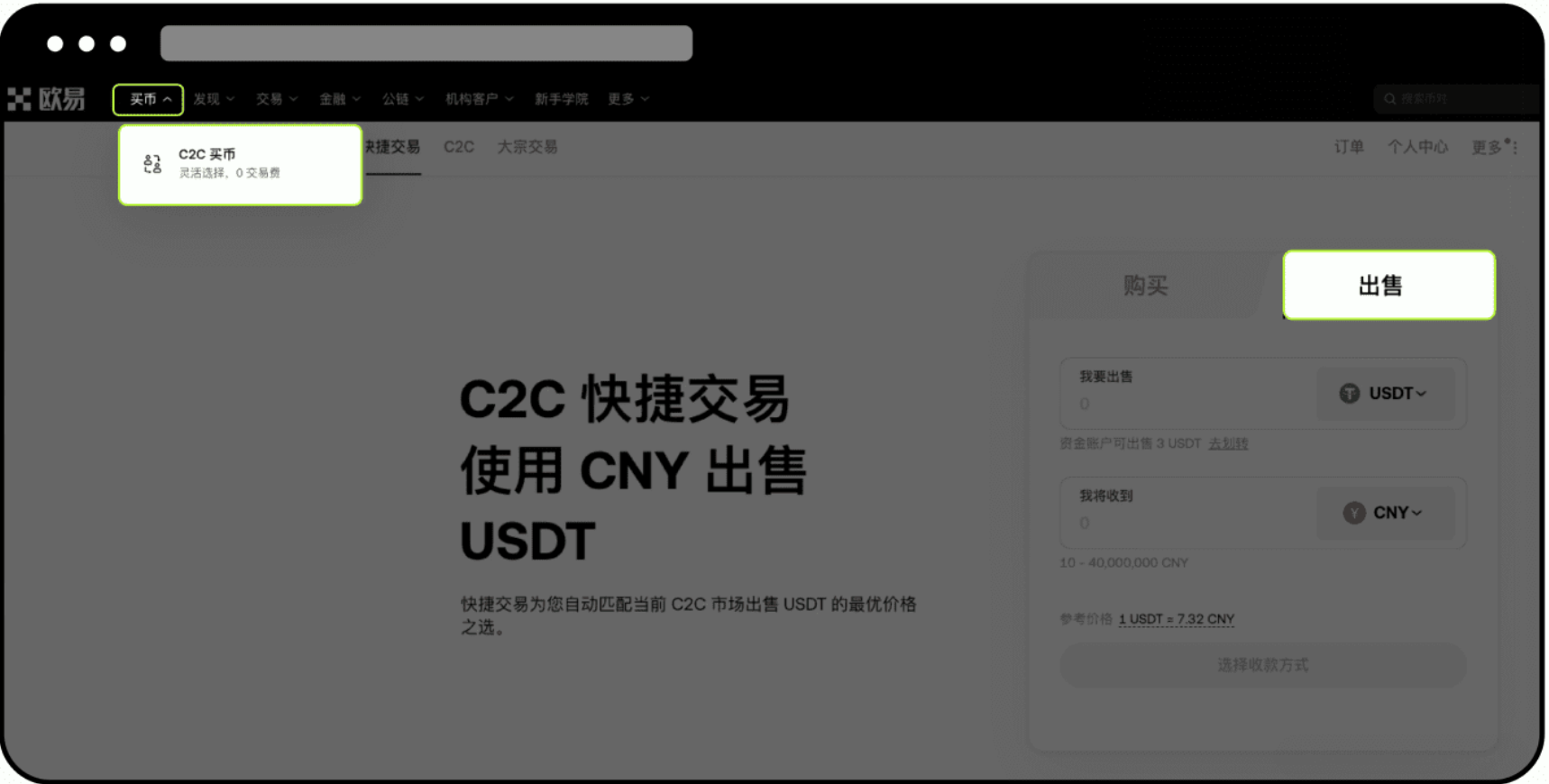 卖币第一步:点【买币】-【C2C 买币】-【快捷交易】,再点【出售】,选好要出售的数字资产;