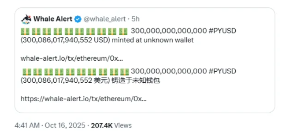 22分钟,300万亿美元,一场链上幻影让稳定币市场心跳加速。10月16日凌晨3点12分,以太坊区块链记录下一笔惊人的交易:稳定币发行商Paxos铸造了300万亿美元PYUSD。这一数字相当于全球GDP的两倍多,足以买下数千家苹果公司。