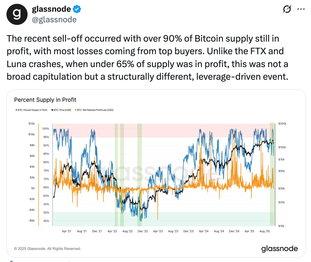 Glassnode 分析指出,在近期这轮抛售潮发生时,仍有超 90% 的比特币供应处于盈利状态,且大部分损失来自顶级买家。这与 FTX 和 Luna 崩盘时的惨状截然不同,彼时仅有不到 65% 的供应处于盈利状态。由此可见,此次并非大规模市场投降式的恐慌抛售,而是一场结构独特、由杠杆驱动的行情波动事件。