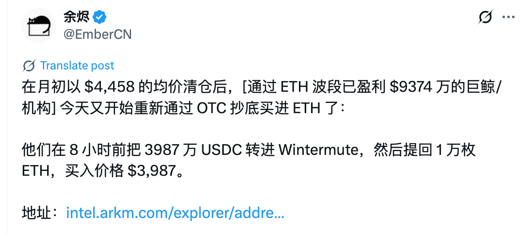 值得关注的是,市场中的「重量级玩家」再度开始活跃起来。据余烬监测,在月初以 4458 美元的均价清仓后,「通过 ETH 波段盈利 9374 万美元的巨鲸/机构」今日重新通过 OTC 抄底买入 1 万枚以太坊,买入价格为 3987 美元。