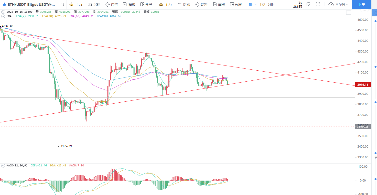今天日内行情几乎没有什么看点,截止目前最大的看点就是下午行情在插针至3937后直接快速百点拉升强势收回,除此之外行情几乎就保持着3980--4050区间震荡,整体走势符合我们上午所说的目前以太走的是一个三角震荡区间,随着可震荡空间越来越小,那么行情的波动也会越来越小 。我们根据上午判断所做的多单目前持有中。