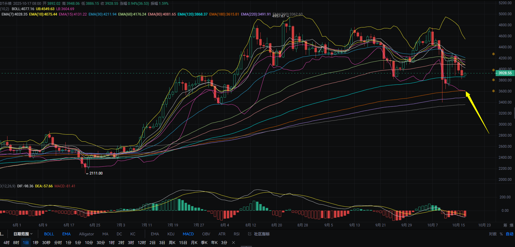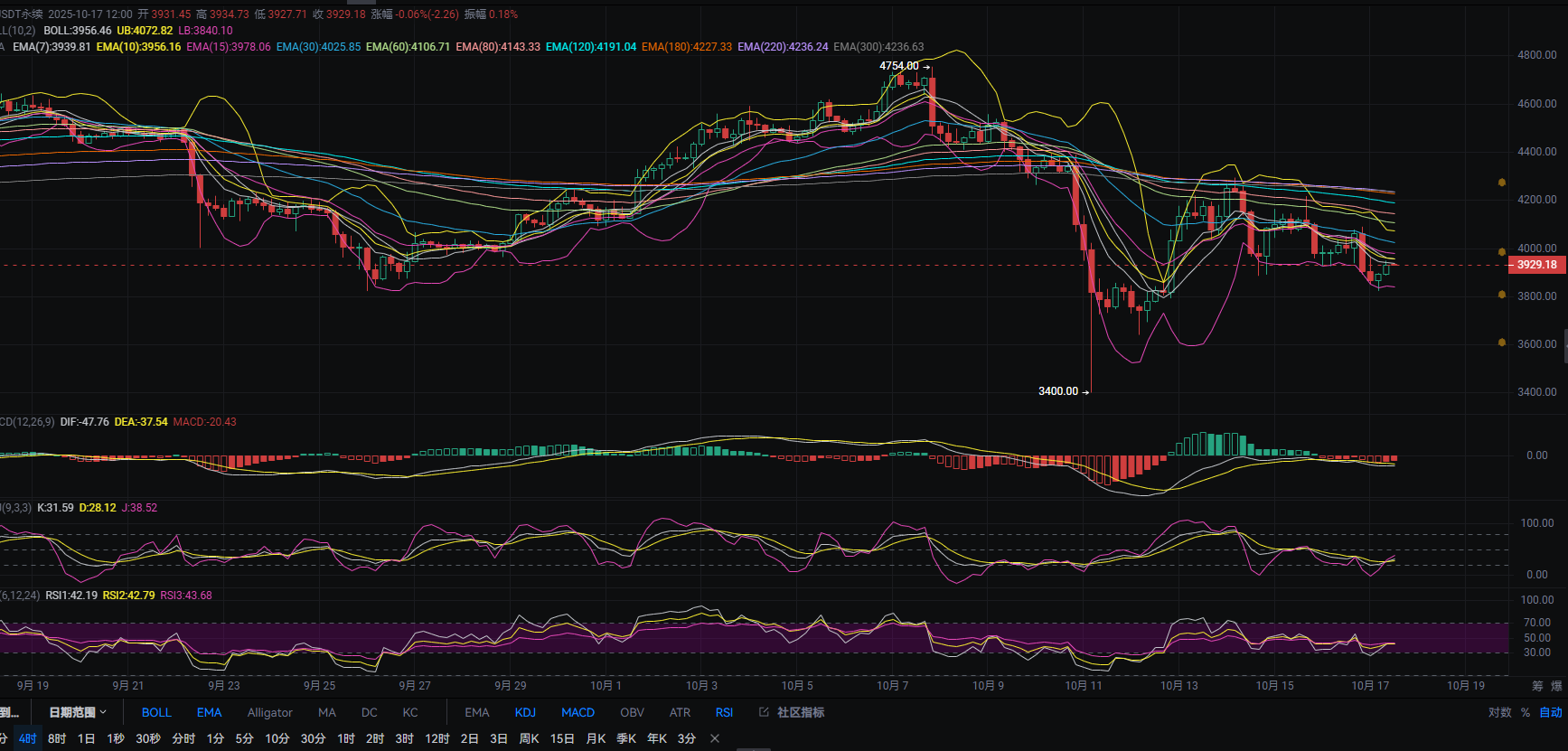昨日历辉说到的日线EMA120(3865)精准到达,那么本周二次下探此处支撑失败还是会到达下轨延伸处EMA180(3615)位置,守住了周末就会走4H中下轨小幅震荡走势,历辉依旧建议反弹空为主!