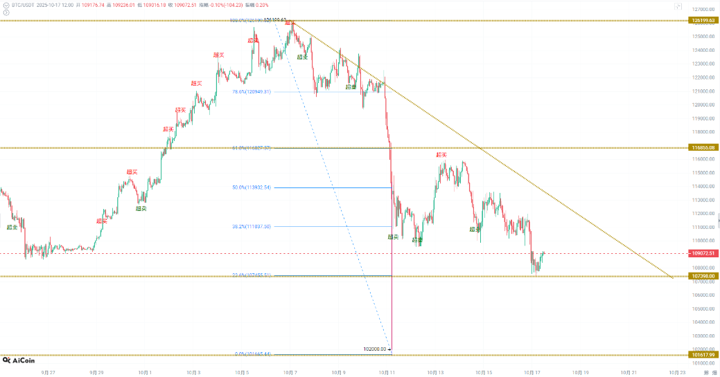 根据BTC/USDT一小时K线图显示,其第一道关键防线位于107,400美元,而更深层的支撑位在101,600美元。