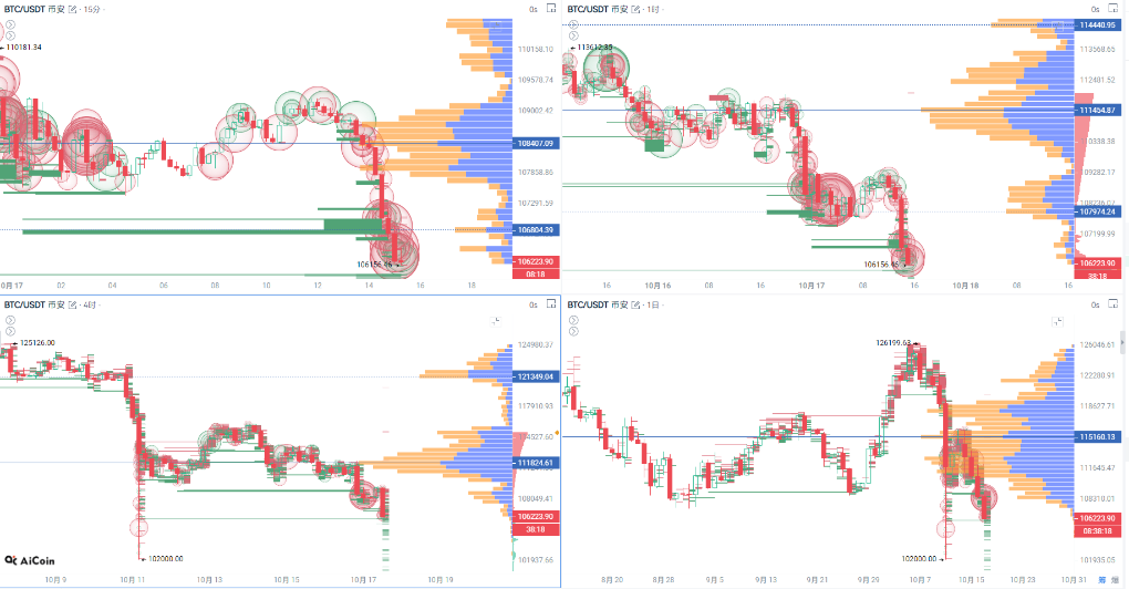 比特币的多周期筹码分布呈现出明显的结构性重组迹象。从4小时和日线周期来看,成交量分布(Volume Profile)显示关键支撑区间集中在10.5万至11万美元附近,其中POC(点位控制)位于约11万美元,形成强力买盘积累区,而上方11.7万美元处筹码堆积超过50万枚,已出现松动迹象,可能引发极限回调至9.8万至10.4万美元。
