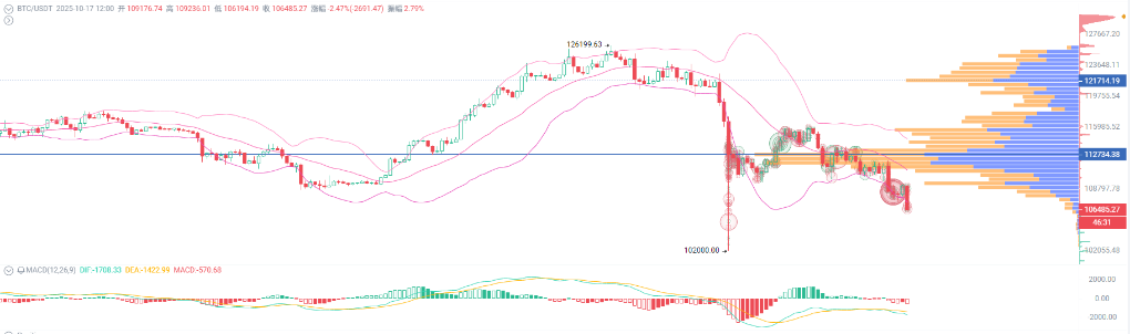 不过,市场也并非全无希望。KDJ指标中,K值(73)与D值(65)已进入强势区,而J值(90)更是触及超买线,这为当前僵局带来了一丝变数。它预示着一场基于小时级别的技术性反弹正在酝酿,可能对107,400的一线支撑进行测试与争夺。