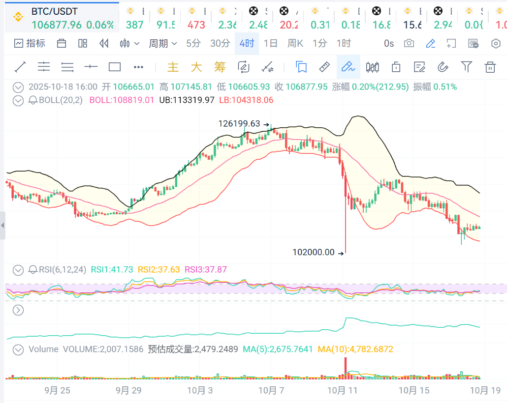 BTC:4小时级别看,价格继续保持在布林线中轨之下,价格走势弱势。