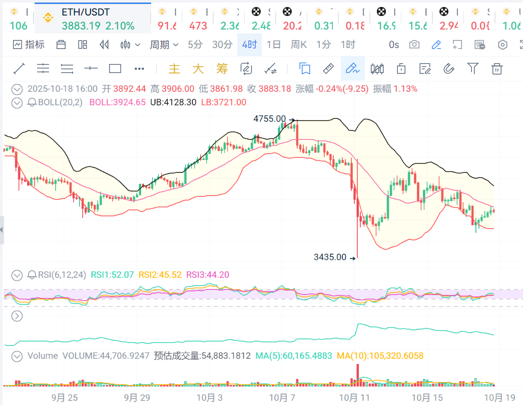 ETH:4小时级别看,价格继续保持在布林线中轨之下,价格走势弱势,支撑位3870,压力位3900.