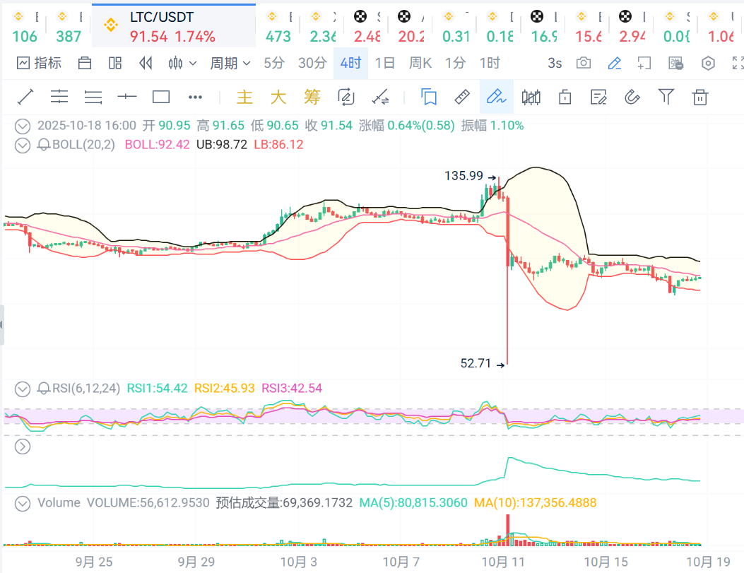 LTC:价格继续保持在布林线中轨之下,价格走势弱势,支撑位91,压力位92.