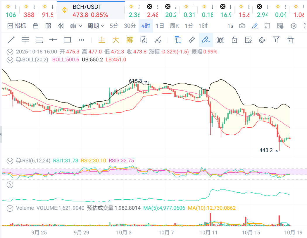 BCH:价格继续保持在布林线中轨之下,价格走势弱势,支撑位460,压力位480.