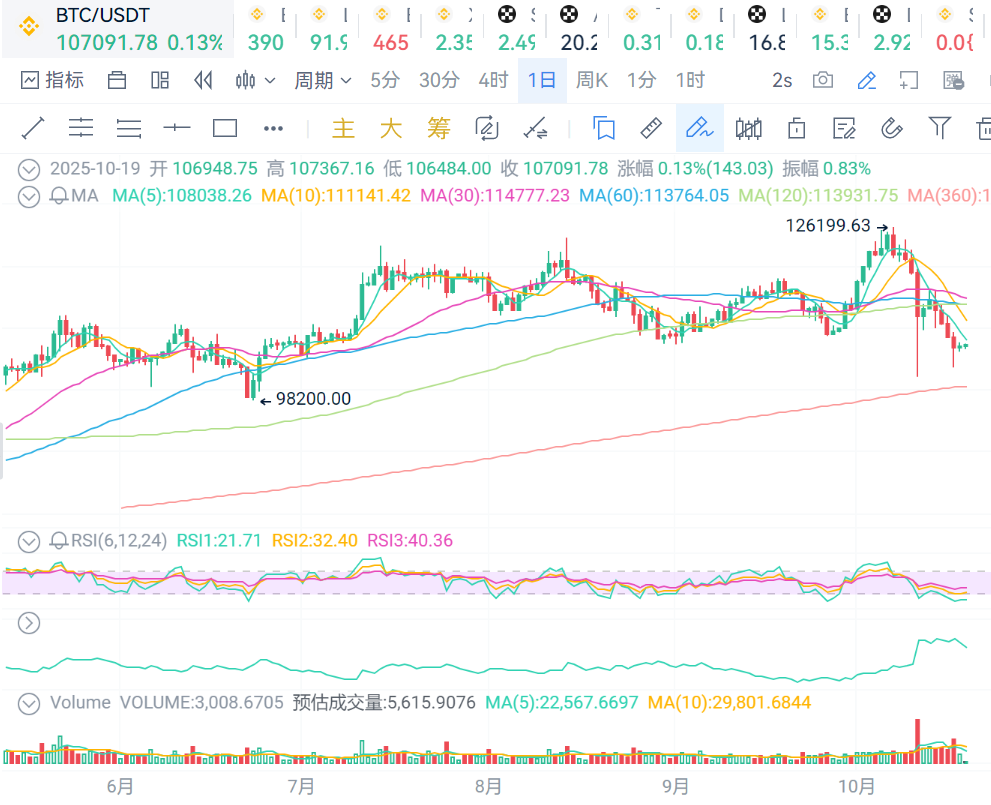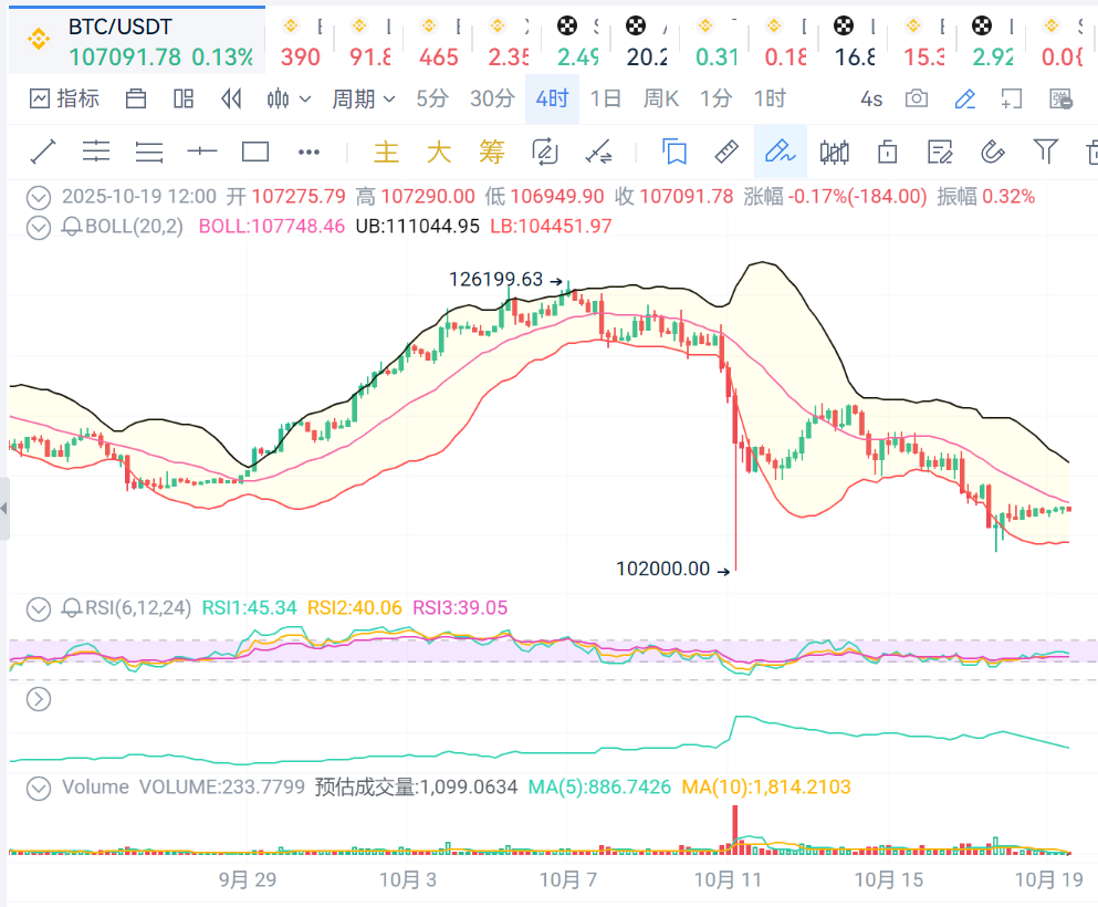 BTC:4小时级别看,价格继续保持在布林线中轨之下,价格走势弱势。