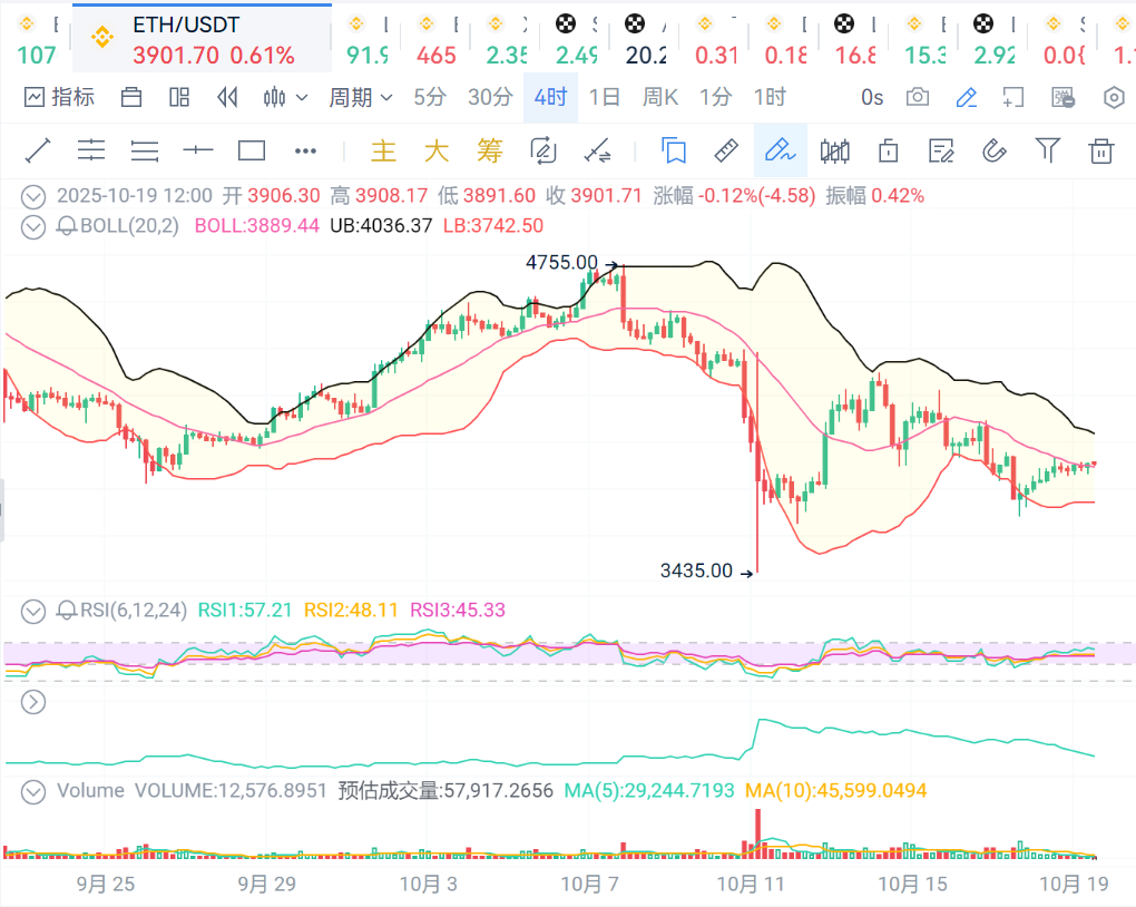 ETH:4小时级别看,价格继续保持在布林线中轨附近震荡,支撑位3890,压力位3910.