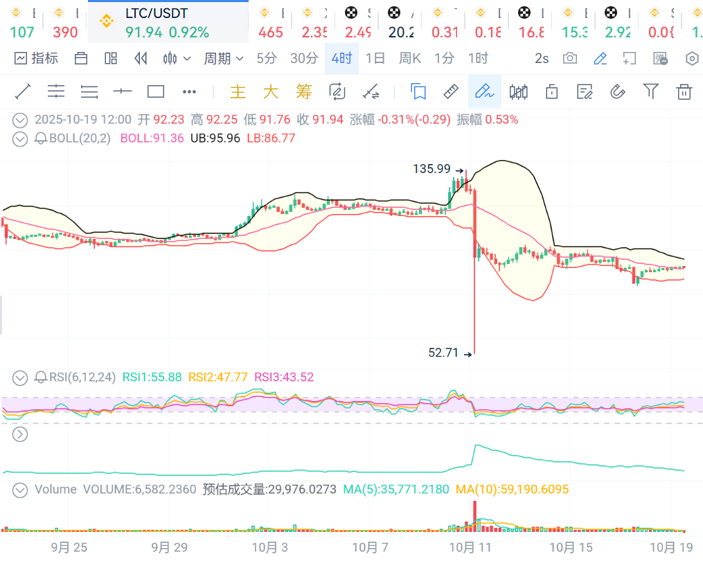 LTC :价格继续保持在布林线中轨附近震荡,价格走势一般,支撑位91,压力位93.