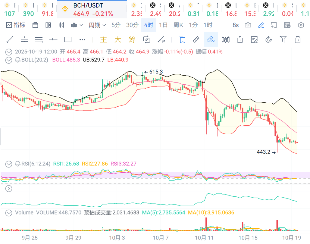 BCH:价格继续保持在布林线中轨之下,价格走势弱势,支撑位450,压力位480.