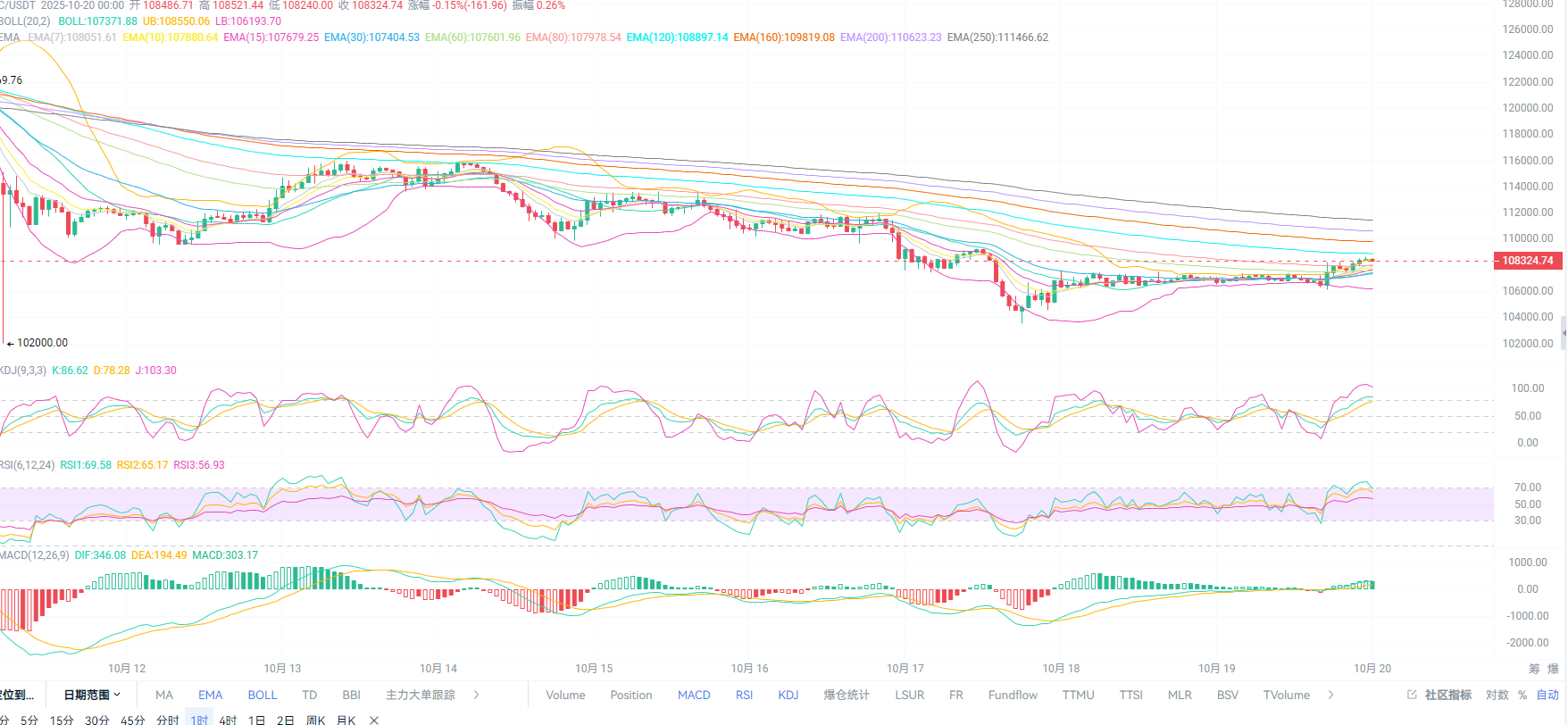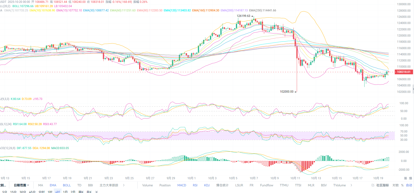 币圈红姐10.20:大饼4H金叉能否打破上轨压力回暖11万?今日比特币(BTC)最新行情分析及操作建议!