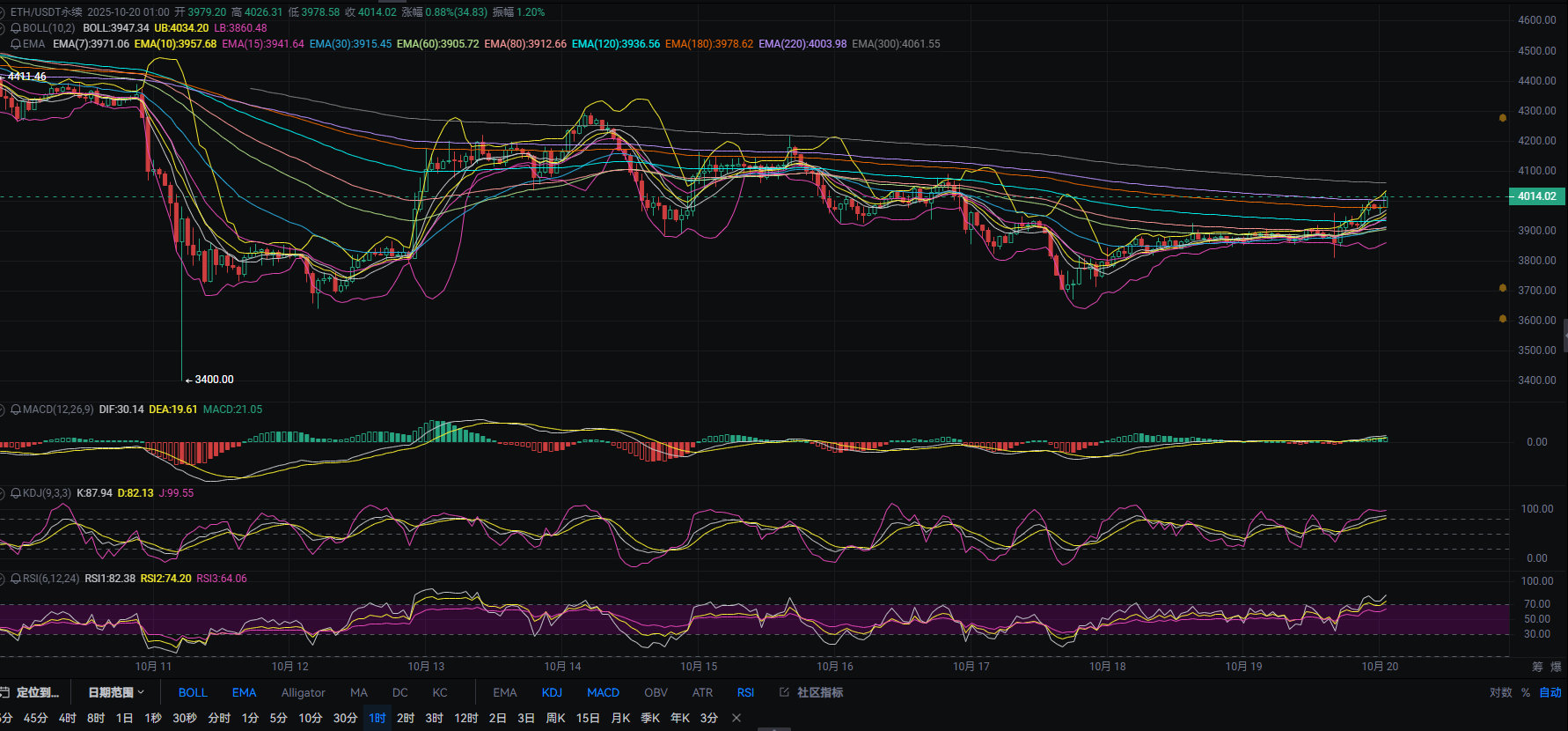 以太坊1小时布林带向上收口,上轨与k线向上穿过EMA220还未止步有进一步接近EMA300的可能,凌晨k线短暂受压走出回调继续向上,但快慢线没有收口,说明短线多头较强,但追多需注意KDJ与RSI短线高位拐头,回撤下方支撑看EMA60与中轨区间!