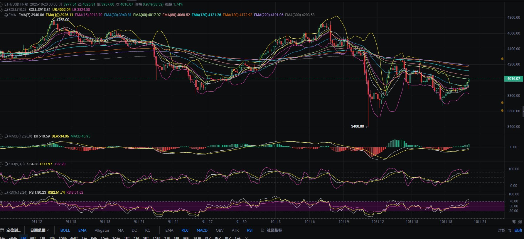 10.20张历辉:日线收口阶段不是多头反转?空头指标继续存在!今日以太坊(ETH)最新行情分析及操作建议!