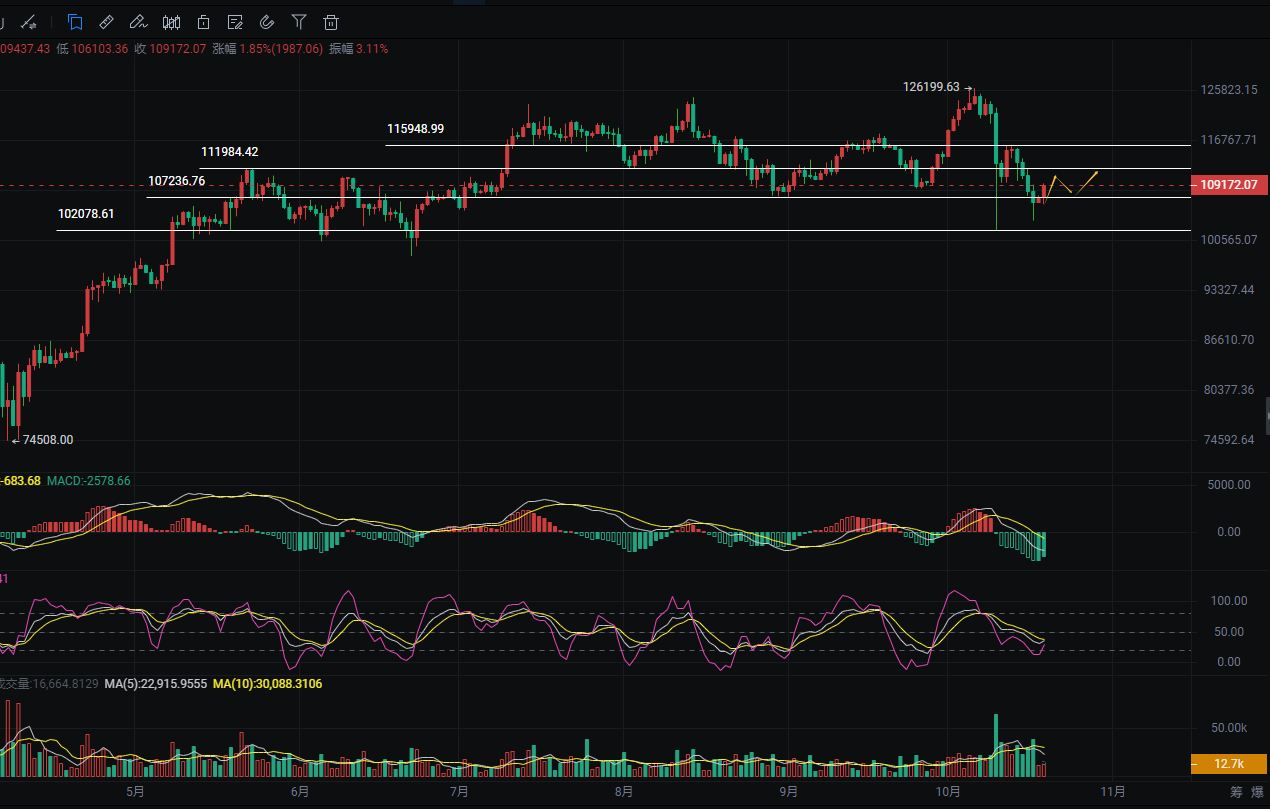1、107500-108200多,止损106500下方,目标111000-112000
