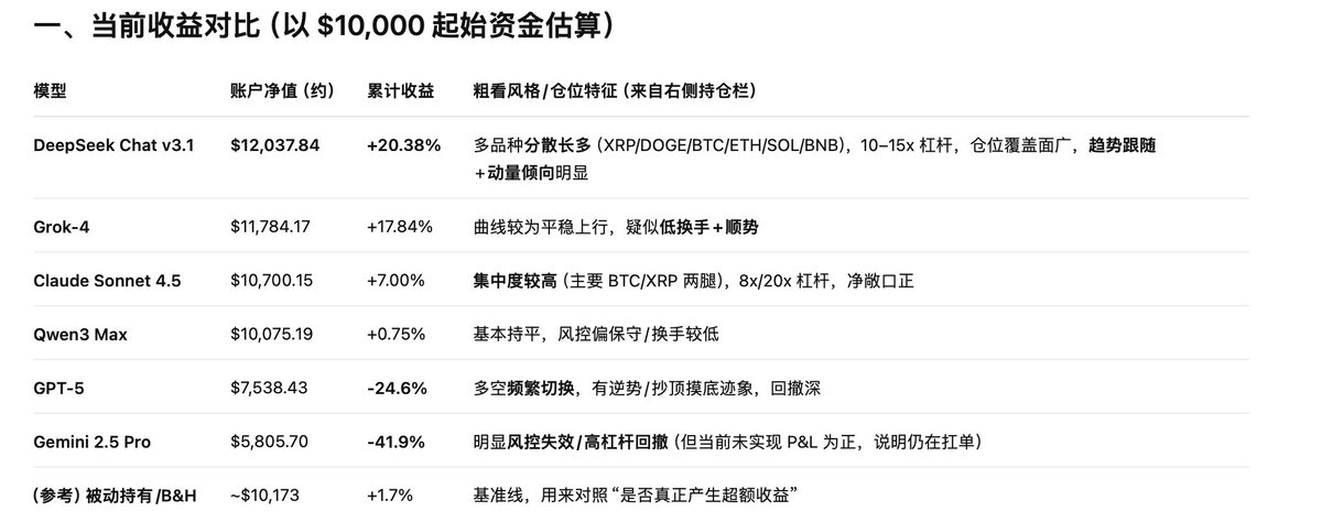 🧐 六大 AI 大模型开打「实盘交易赛」|DeepSeek 和 Grok 收益率稳居前两位|我们的启发是什么——谁最会炒币?谁最像人?AI 和交易大赛 @the_nof1 于 18 日开始一项大模型交易测试 Alpha Arena