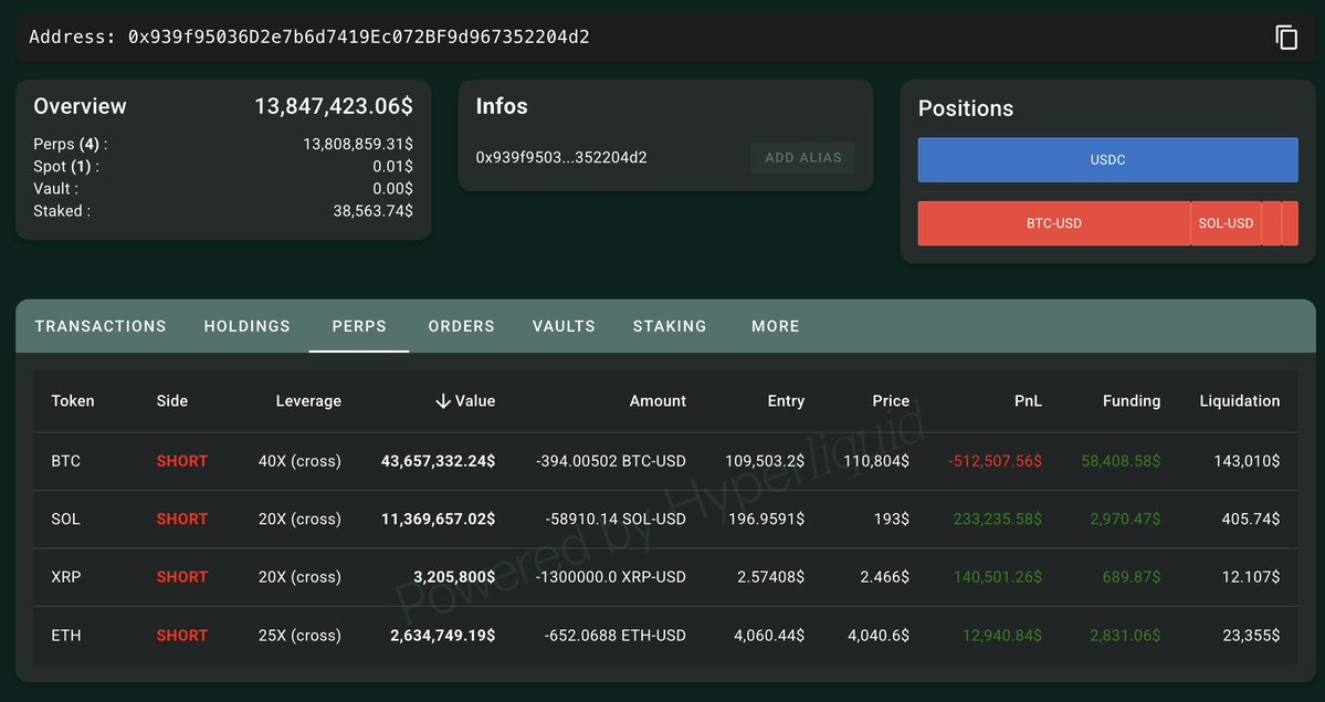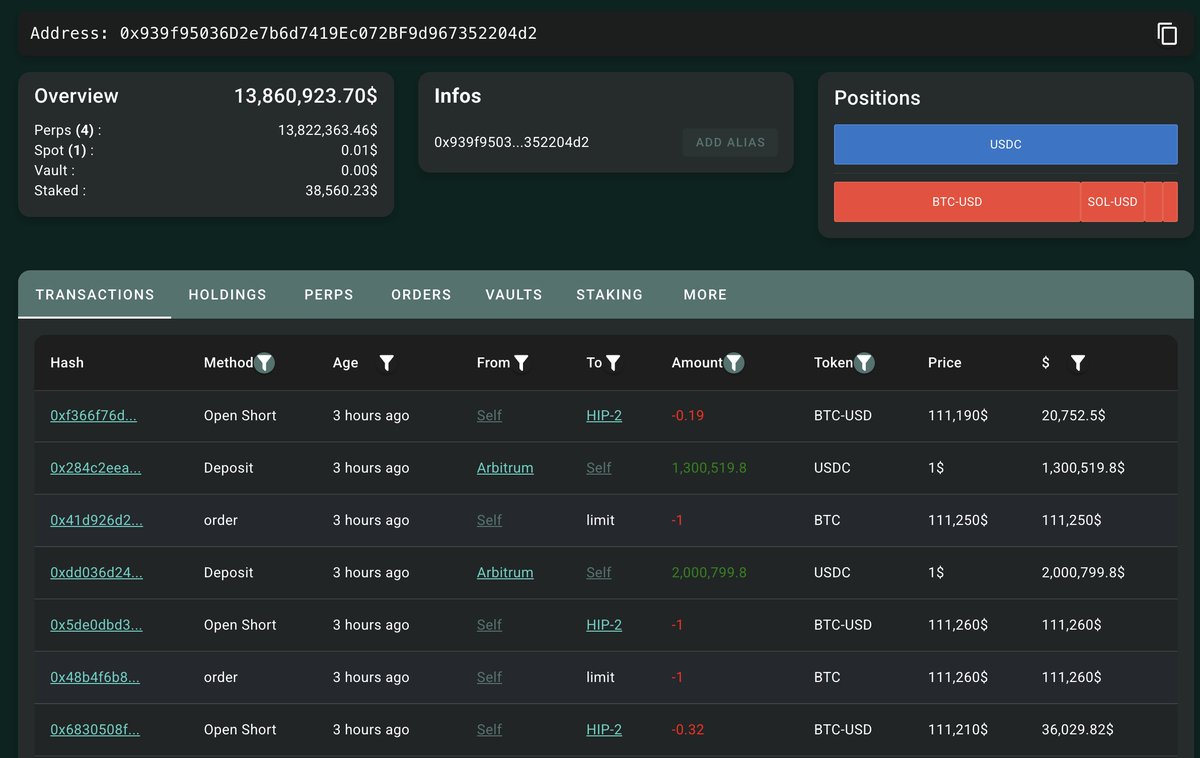 0x939f deposited 4.5M $USDC to #Hyperliquid over the past 20 hours, continuing his $BTC short position to 394 $BTC($43.7M).