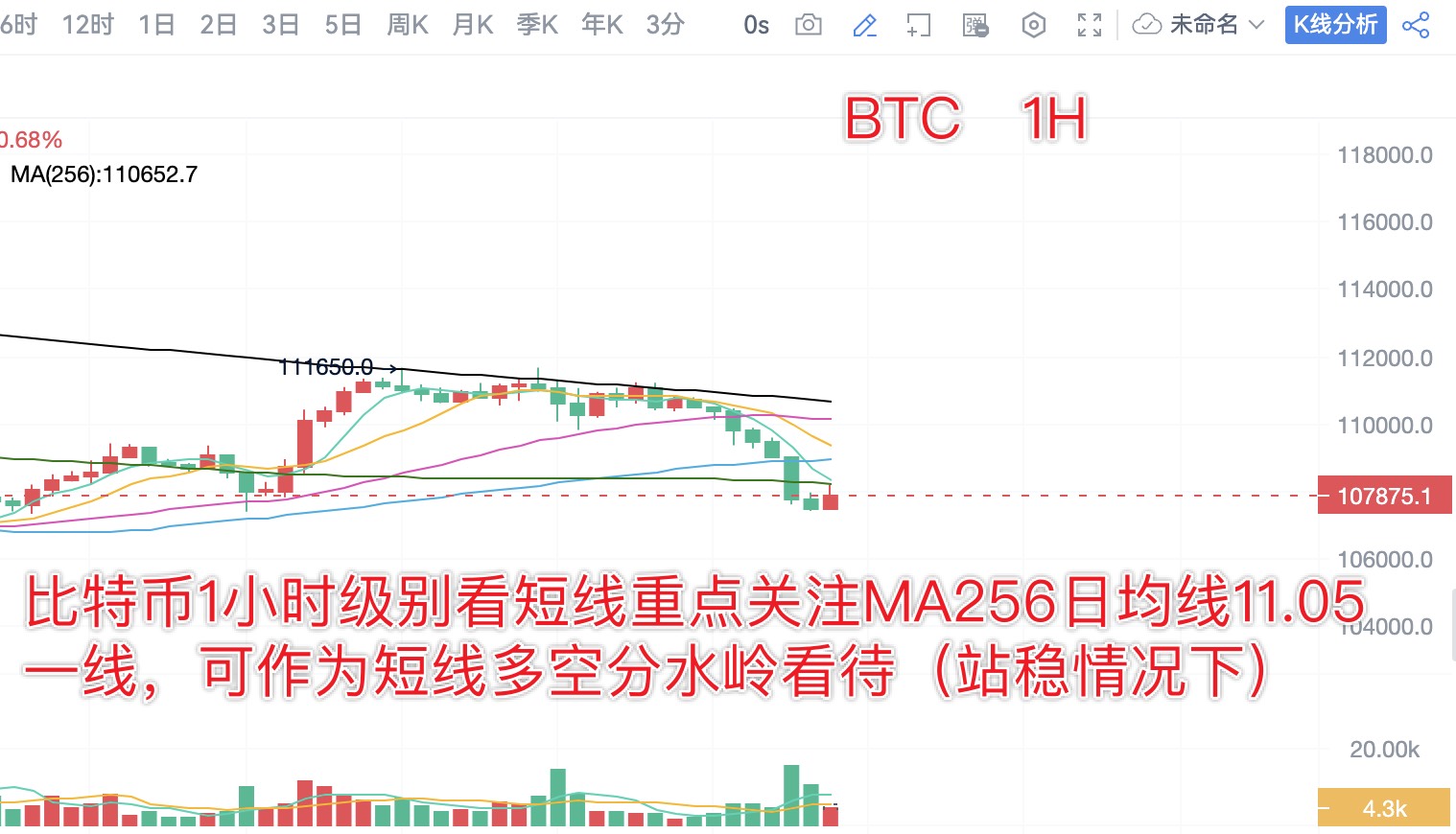 比特币从日线图看,日线反弹至11万上方后开始回踩,日线目前反弹至MA5/10日均线上方后开始回踩向下,如继续保持弱势回踩则将再度向下测试MA256日均线10.36一线支撑,1小时级别看,前几日价格反弹测试了MA256日均线后明显承压向下,短线的关键压力关注此一线11.06一线即可,在未突破站稳此一线上方之前,继续以弱势震荡对待即可。