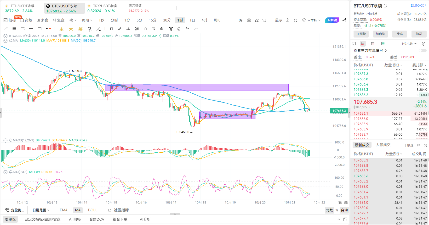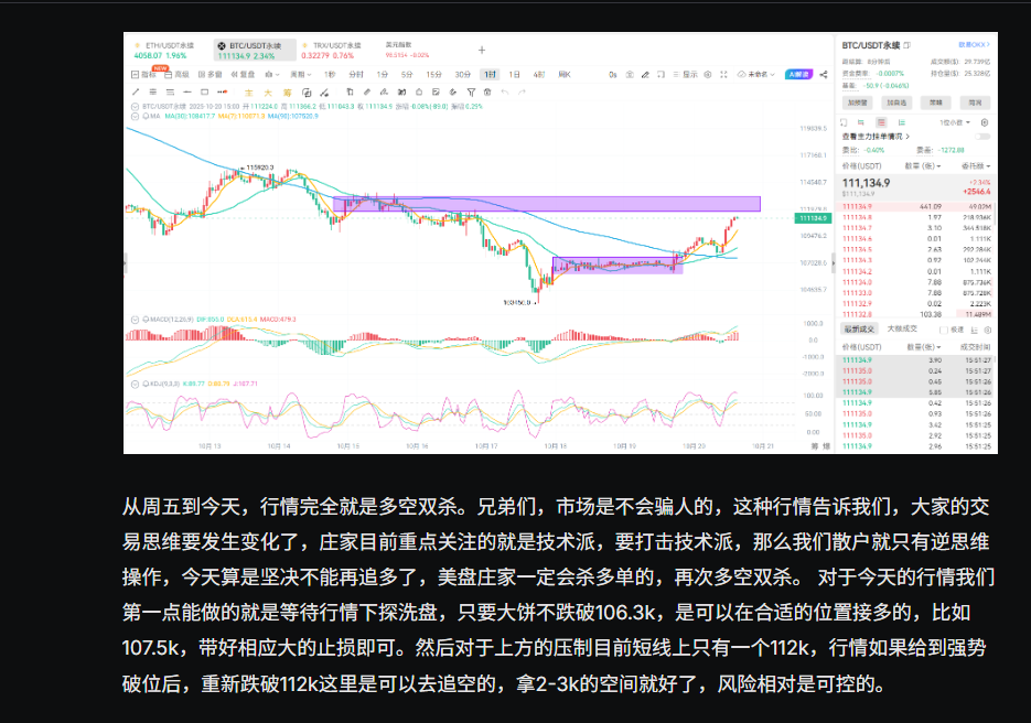 多日没有给出更新,昨天小小更新了一下,策略完美止盈,容我小小的装一下。看图说话,昨天我给出了比特币的上下方支撑和压制,晚间11点左右达到压制位之后就直接进行回落,昨天文章中我也是再三强调让大家不要追多,晚上美盘一定大跌埋多单的,果不其然,盘中直接瀑布。下面给我到的可以布局多单的唯一位置是107500,在今天下午也是给到了位置,行情目前小幅反弹了500多点。对于短线来说将就吃吃。