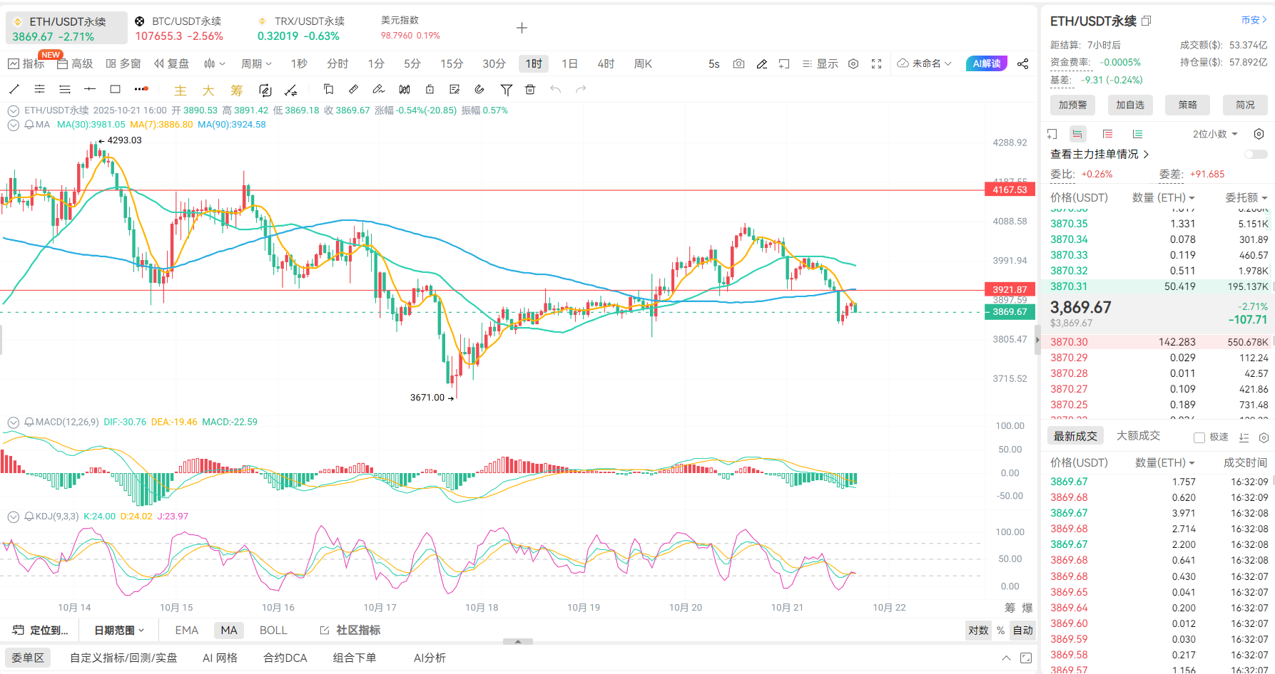 以太坊方面,日线仍呈下行结构,若 4300‑4100 区间不破,跌势概率更大。短线在 3640‑4220 区间震荡,若跌破 3890,流动性将被快速清扫。