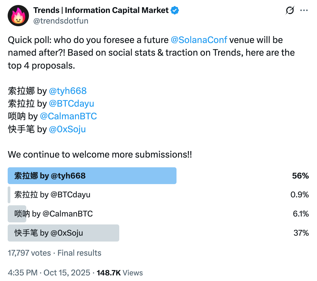 Solana 的中文化命名提议正是在这个关键时期被提出。10 月 14 日,内容代币化平台 Trends.fun 发起「为 Solana 征集中文名」活动,并设置 100 枚 SOL 的奖池。