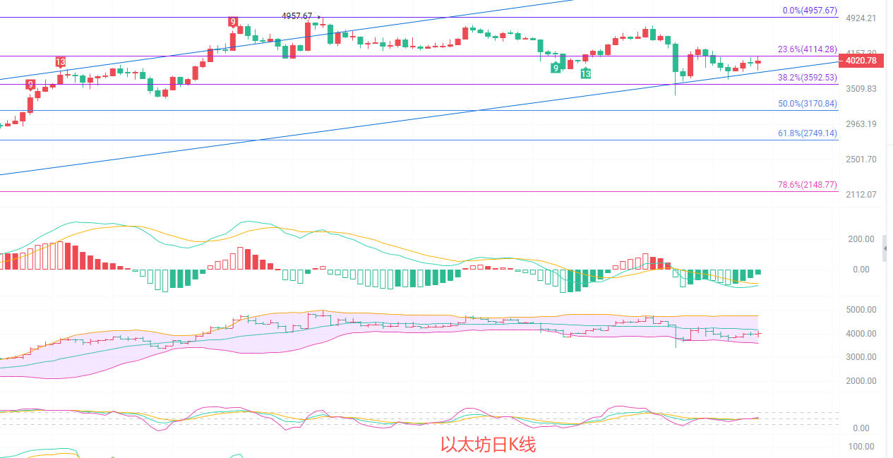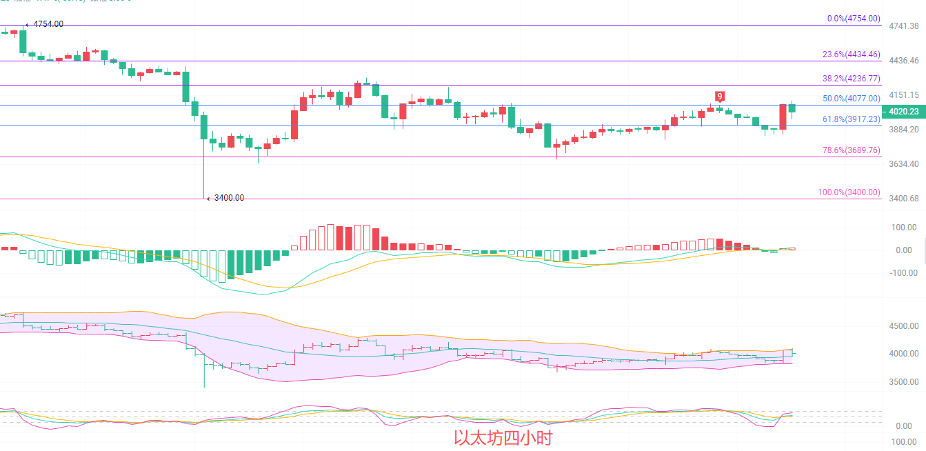 四小时K线慢跌了两天,一朝扳回破了前高4077,也试探EMA120一线4095的阻力,预计主力会在分割线0.5这个位置横盘从新选择防线,MACD缩量被扳回并且放量上行的行情,加上DIF和DEA在4000关口多空来回交换,可以考虑在破前高以后南下,布林带上轨压力关注4085,下轨关注3830,南北的入场点可以以此为基点选择