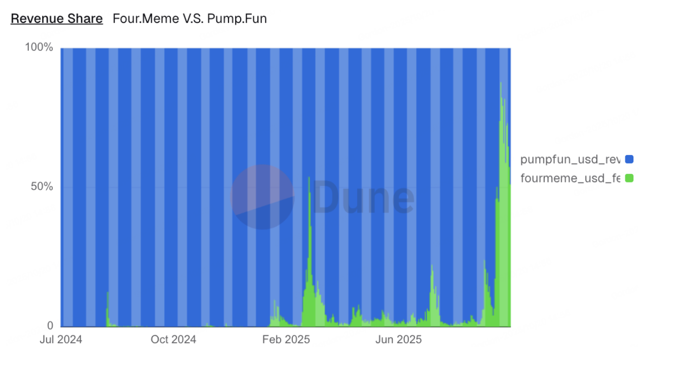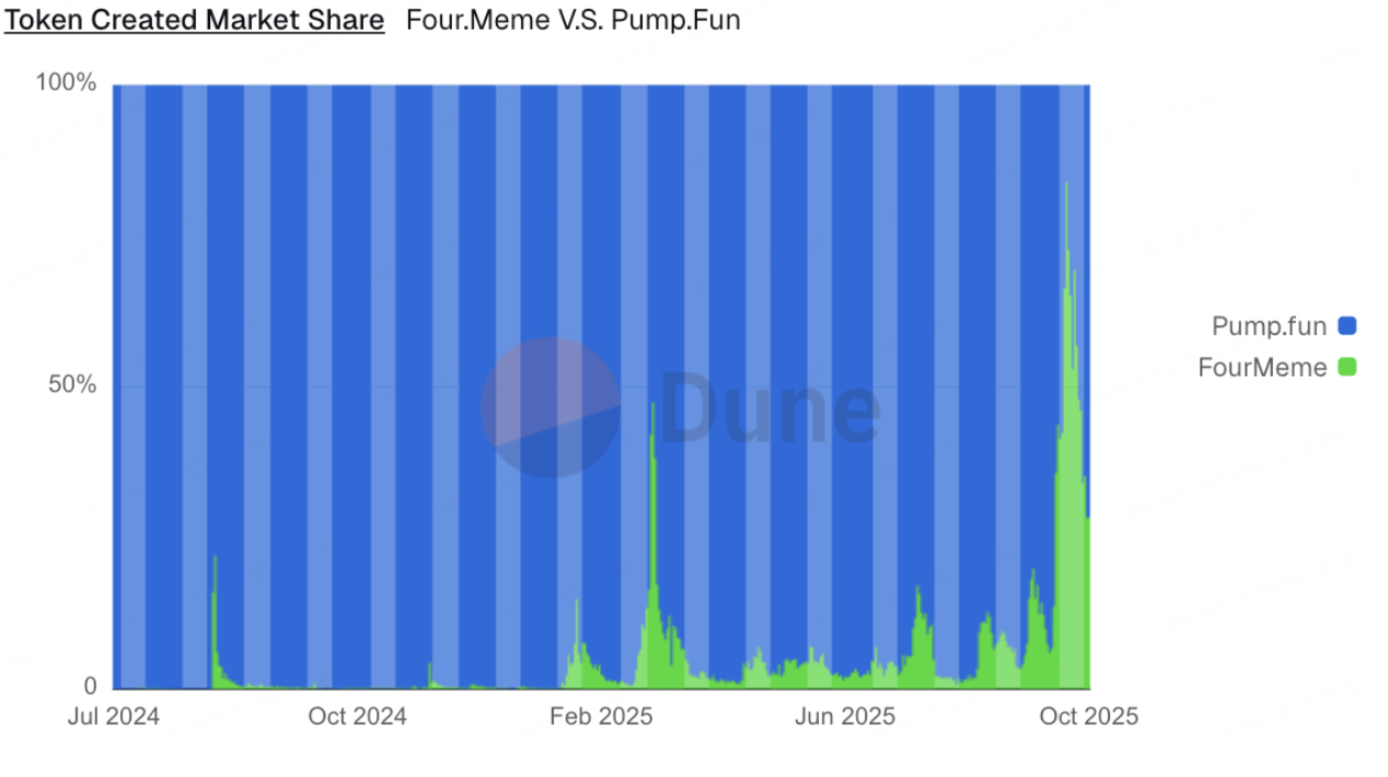 自8月以来,Solana链上新建代币数量出现了明显下降。Solscan数据显示,8月至10月中旬,Solana新建代币数量从平均的35000-40000下降至15000-20000,这一方面是受到加密市场行情转淡的影响。此外如下图可见,10月以来fourmeme与Pump.fun的市占率对比中,fourmeme市占率最高达到至83.9%,收益率最高达到87.8%。由此可见10月以来BSC的中文meme热潮的爆发而分流了大量资金。链上数据显示,10月8日BNB链DEX交易量曾飙升至约60.5亿美元创下年内第二高,说明币安生态的投机活跃度大幅上升,不少原本活跃在Solana链的流动性被吸引过去。