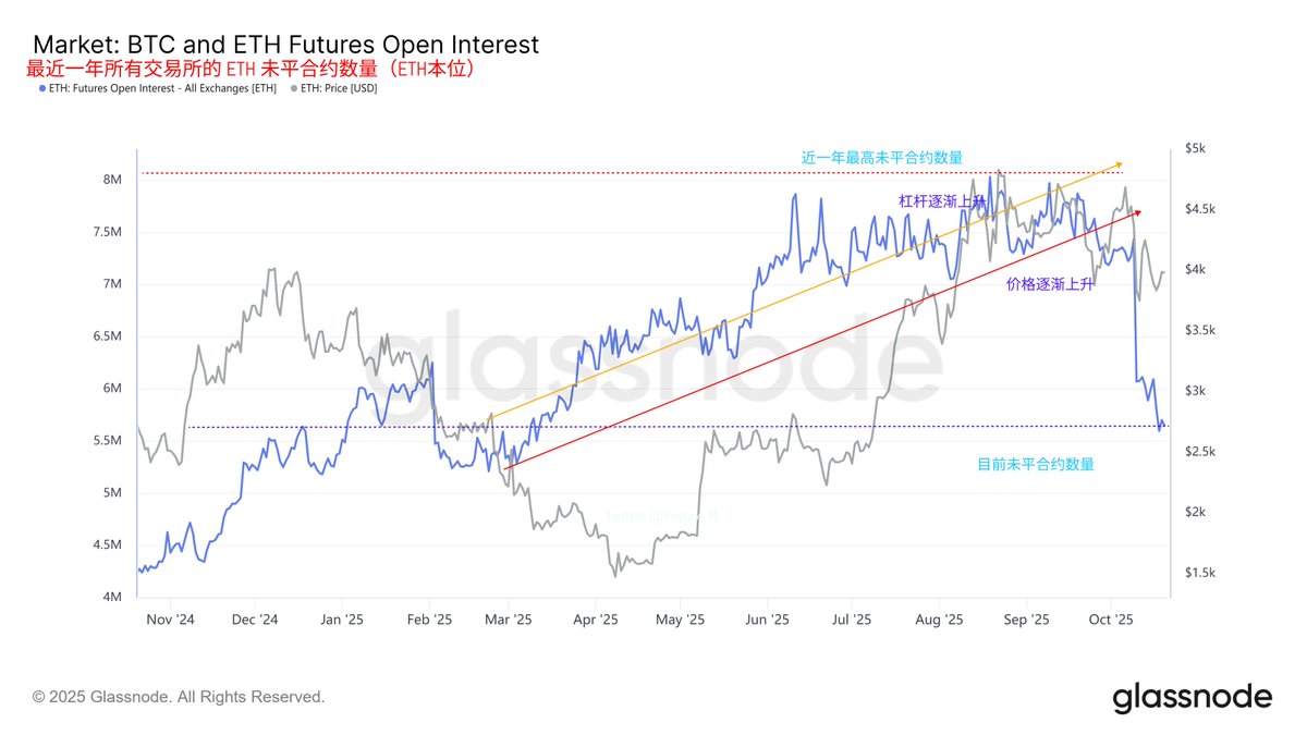 现在 BTC 已经到了最近一年的未平合约的最低点,杠杆应该已经所剩不多了,而 ETH 也从减掉三分之一的杠杆变成了减掉一半的杠杆。