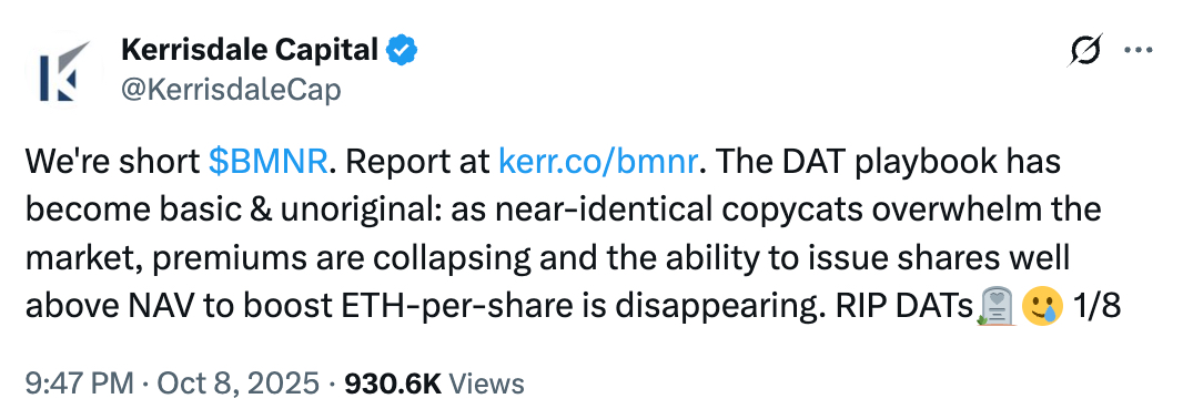 知名做空机构 Kerrisdale Capital 曾公开表示,将做空 BitMine。其认为,目前 DAT 模式已逐渐走向平庸,市场竞争加剧导致溢价迅速下滑,发行方难以再通过高于净值(NAV)增发股份来提升每股 ETH 持有量。曾经追逐「加密资产国库策略」的公司原计划筹集超 1000 亿美元资金,却因此打破了支撑高溢价的稀缺性。如今,许多此类公司股票交易价已接近或低于净值,自我循环机制陷入停滞,溢价交易逻辑也不再成立,整个模型开始崩塌。