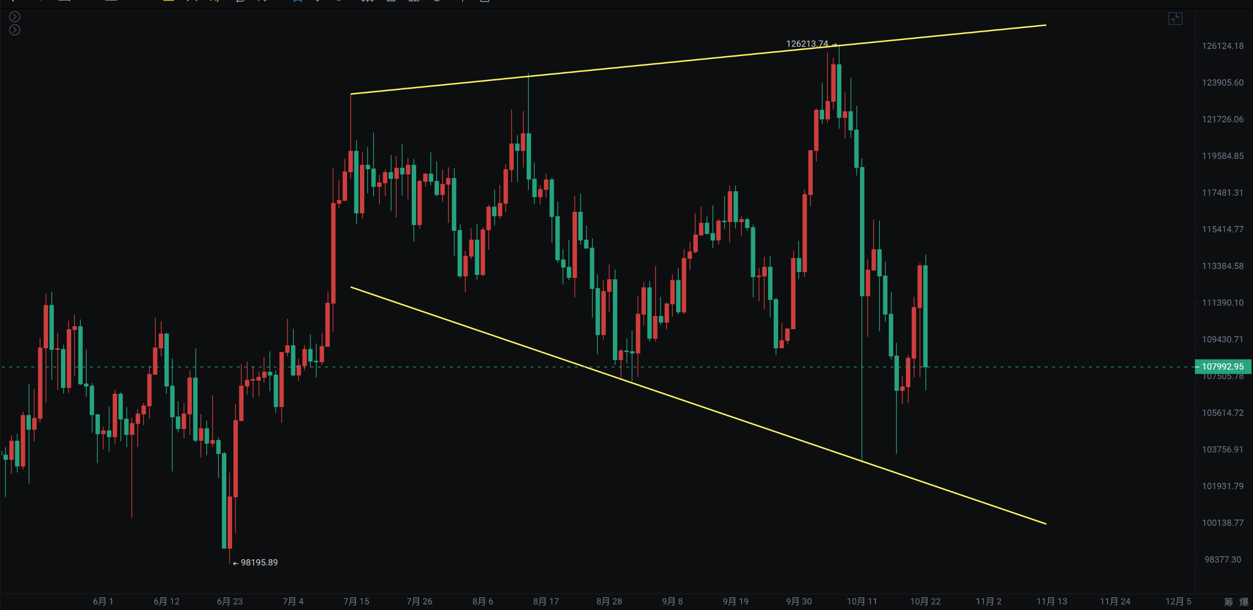 目前关于比特币牛熊市的讨论越来越激烈,80%一90%的人都认为牛市已经结束、转熊市,但是也有一部分人认为四年周期已经被打破,现在是乱纪元。自10月11号插针以来,比特币的走势仍然非常弱,目前反弹位超过斐波那契的0.5,所以接下来很长一段时间可能会在101516至120000下方震荡。