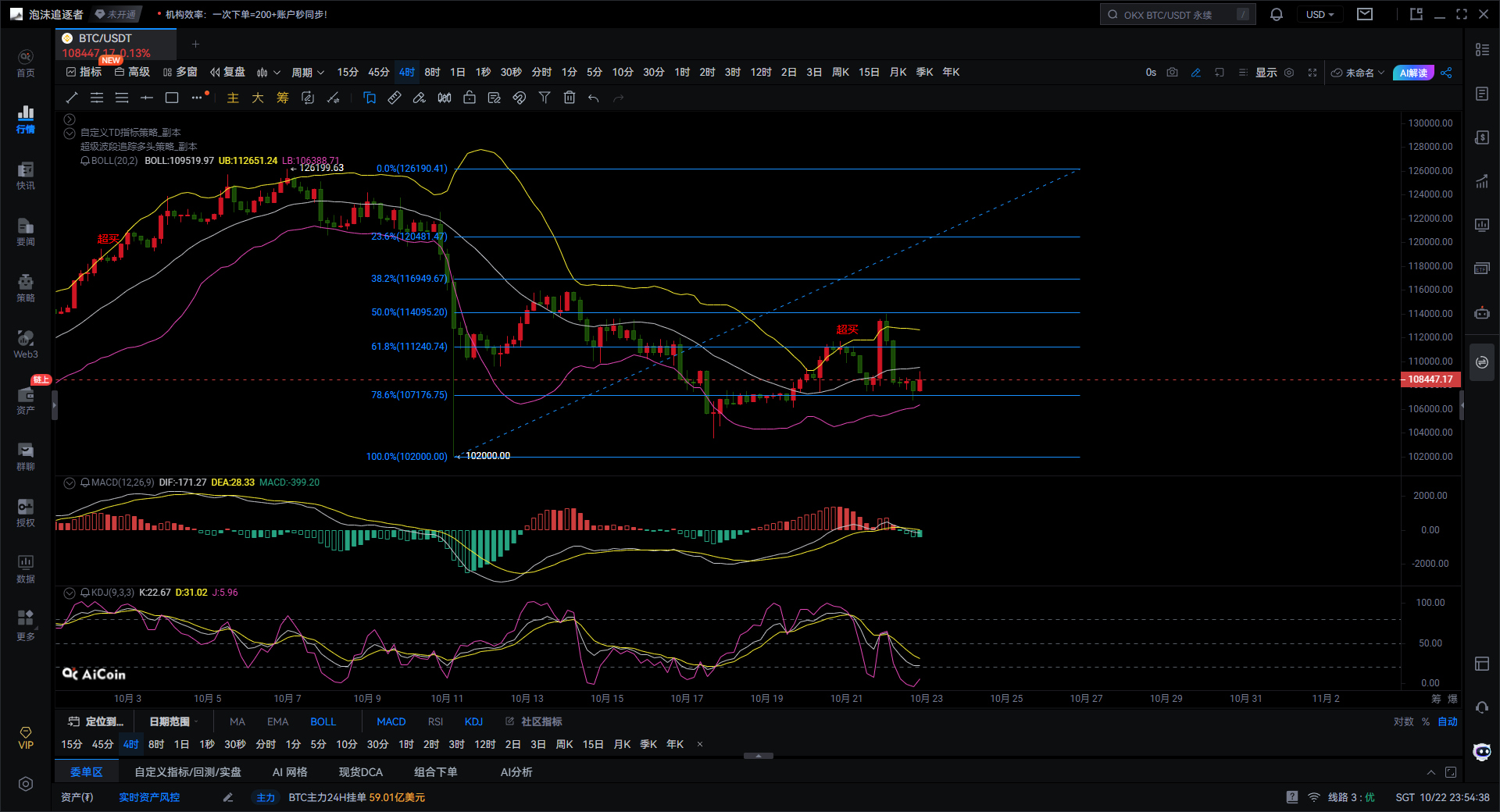 MACD指标显示DIF线略低于DEA线,形成死叉状态,绿色柱状图表明短线反弹动能正在减弱。10月中旬的金叉反弹已消耗殆尽,若出现新的死叉配合绿色柱状扩张,价格可能继续下探。但若能在108000上方企稳,则可能形成新的金叉信号。